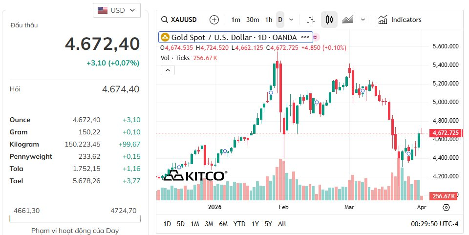 Thậm chí trong phiên 31/3, có lúc giá vàng giao ngay tiến sát ngưỡng 4.690 USD/oz, mức cao nhất kể từ hôm 20/3.