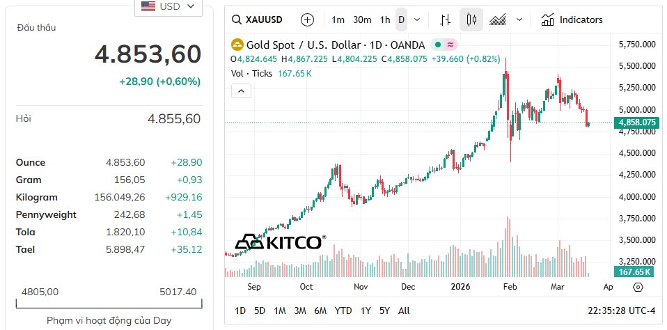 Việc SPDR liên tục xả hàng trong bối cảnh giá vàng “tụt dốc” từ mức 5.400 USD/oz hồi đầu tháng 3 xuống vùng 4.800 USD/oz (chốt phiên 18/3). Đà sụt giảm 11% này đẩy giá vàng rơi sâu về mức thấp nhất 6 tuần.