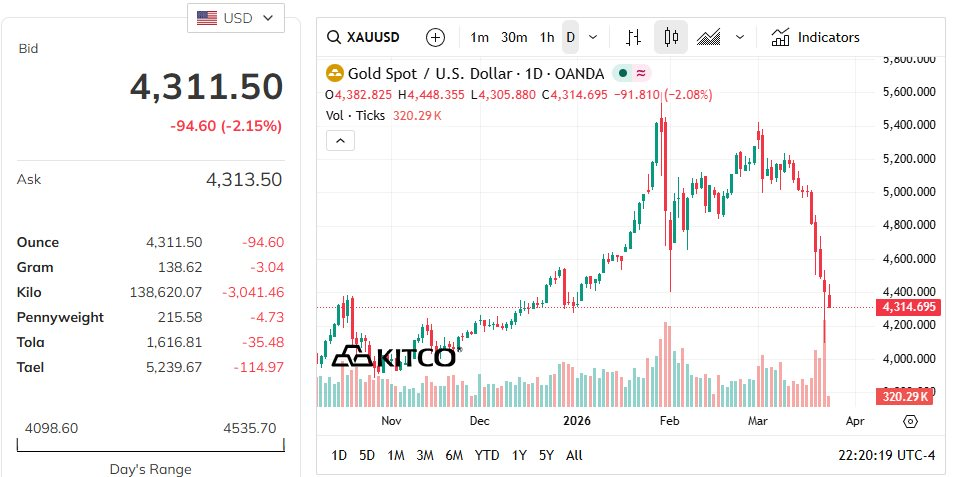 Động thái “xả kho” của quỹ vàng SPDR chưa có dấu hiệu dừng lại trong bối cảnh giá vàng liên tục “tụt dốc”, giảm phiên thứ 9 liên tiếp. Đáng chú ý, đà bán tháo đã xuất hiện trong phiên 23/3 khi có thời điểm giá vàng thế giới (theo Kitco) đã về dưới mốc 4.100 USD/oz trước khi rút chân lên vùng 4.400 USD/oz, tương ứng vùng giá hồi đầu năm.