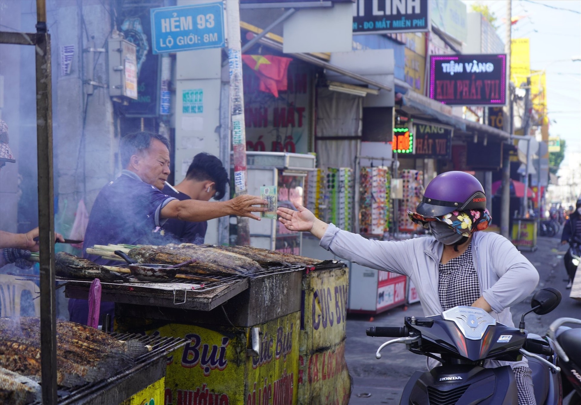 Theo nhiều tiểu thương, giá cá lóc nướng năm nay sẽ tăng hơn năm trước vì giá cá nhập vào từ các thương lái tăng. Giá bán năm trước từ 150 - 250 nghìn đồng/con thì năm nay giá tăng lên đến gần 300 nghìn đồng/con tùy vào trọng lượng cá (giá đã bao gồm rau cùng bún ăn kèm). Ảnh: Báo Lao Động