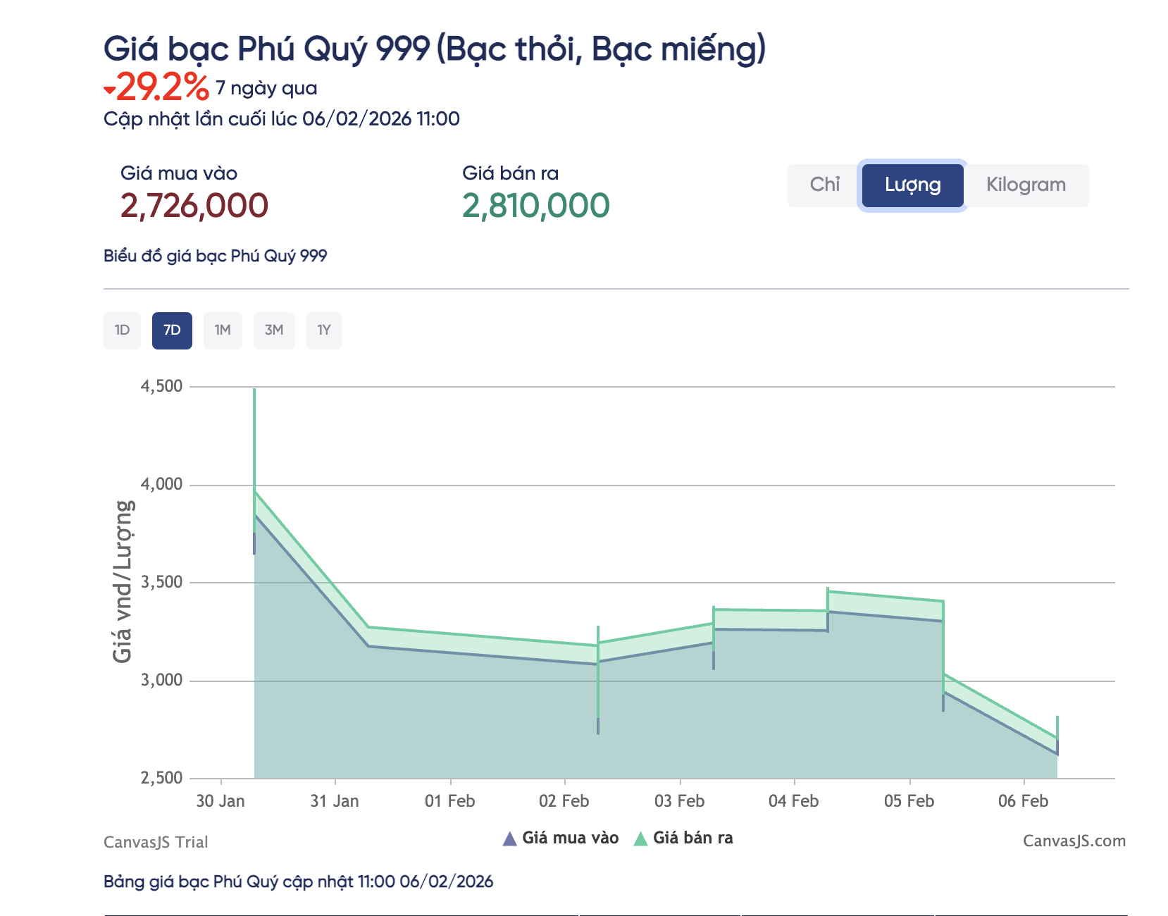 Tập đoàn Phú Quý niêm yết giá bạc miếng lần lượt 2,69 triệu đồng và 2,77 triệu đồng/lượng cho chiều mua vào – bán ra, mất thêm 620.000 đồng mỗi lượng.