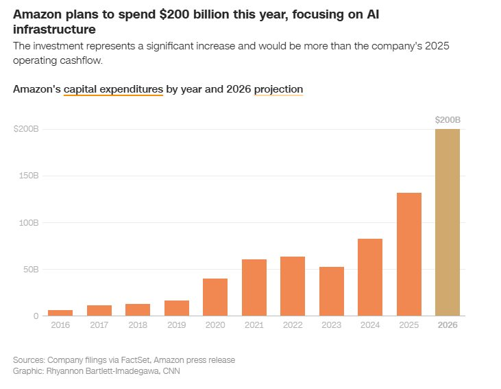 Thị trường đang chứng kiến một cuộc chạy đua vũ trang thực sự về hạ tầng. Amazon dự kiến chi tới 200 tỷ USD cho chi phí vốn (CapEx) trong năm nay, chủ yếu đổ dồn vào cơ sở hạ tầng AI. Con số này cao hơn 50 tỷ USD so với dự báo của các nhà phân tích và vượt xa mức 131,8 tỷ USD mà họ đã chi cho thiết bị, bất động sản vào năm 2025.