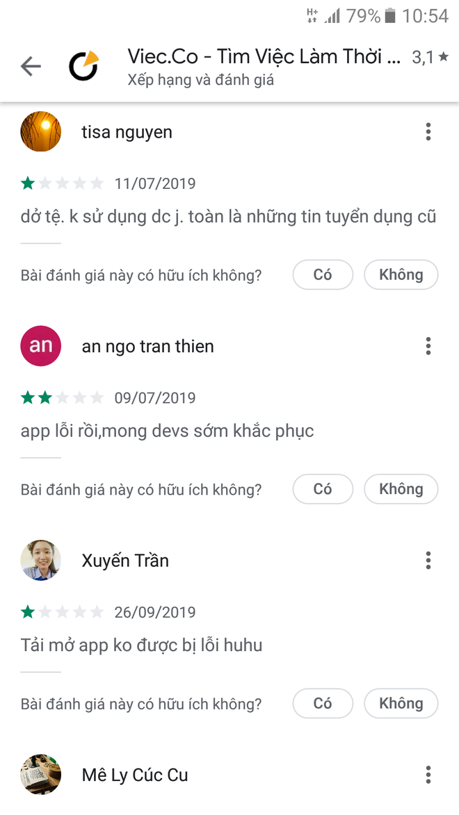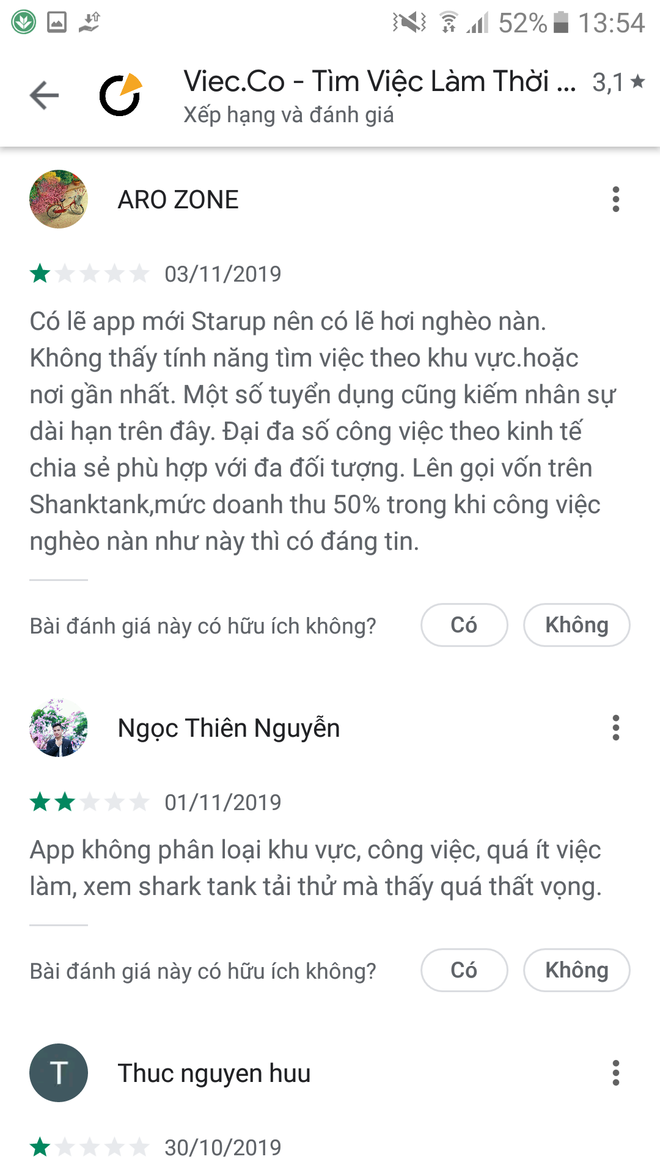 Đa phần những đánh giá 1 sao tập trung vào hai vấn đề: App hoạt động không ổn định và số đầu công việc xuất hiện còn sơ sài.