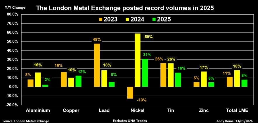 Lượng hợp đồng mở (open interest) của hợp đồng tương lai LME kết thúc năm 2025 tăng 15% so với 2024, lên mức cao nhất kể từ đầu năm 2021.