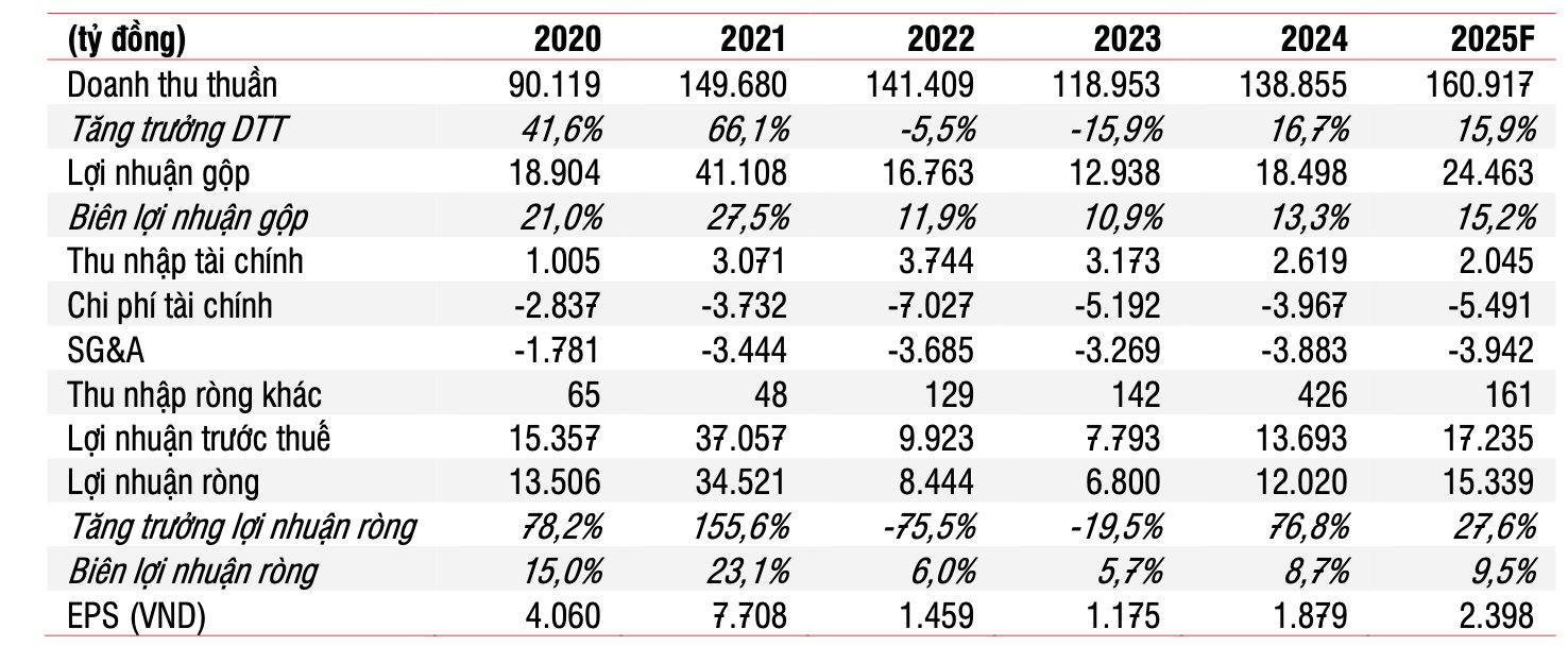 Đội ngũ phân tích dự báo giá bán bình quân của thép xây dựng và HRC sẽ giảm lần lượt -2% và -7% svck trong năm 2025, khi công ty có khả năng giảm giá thêm để thúc đẩy sản lượng tiêu thụ. Tuy nhiên, biên lợi nhuận gộp sẽ được cải thiện từ 13,3% trong năm 2024 lên 15,2% trong năm 2025 nhờ sản lượng tiêu thụ cao hơn.