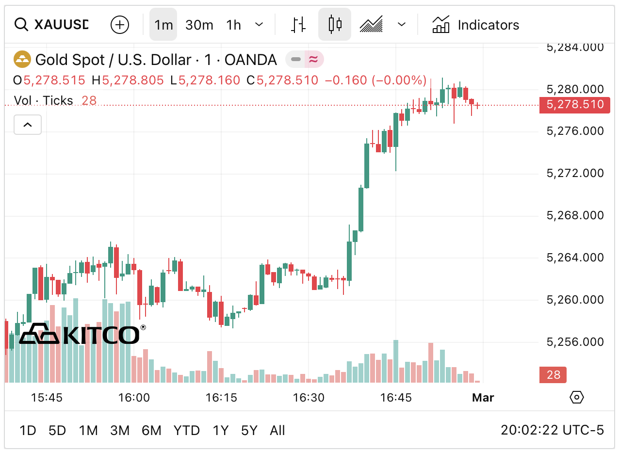Giá vàng thế giới một lần nữa lấy lại đà tăng và vượt mốc 5.200 USD/ounce, khi những bất ổn địa chính trị tại Trung Đông tiếp tục thúc đẩy nhu cầu trú ẩn an toàn. Tại thời điểm ghi nhận, giá giao ngay đang giao động quanh mức 5.278 USD/ounce, tăng hơn 2% so với cuối tuần trước.