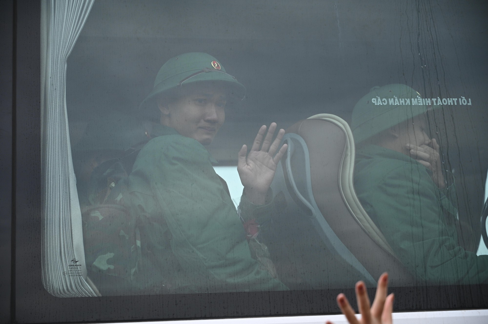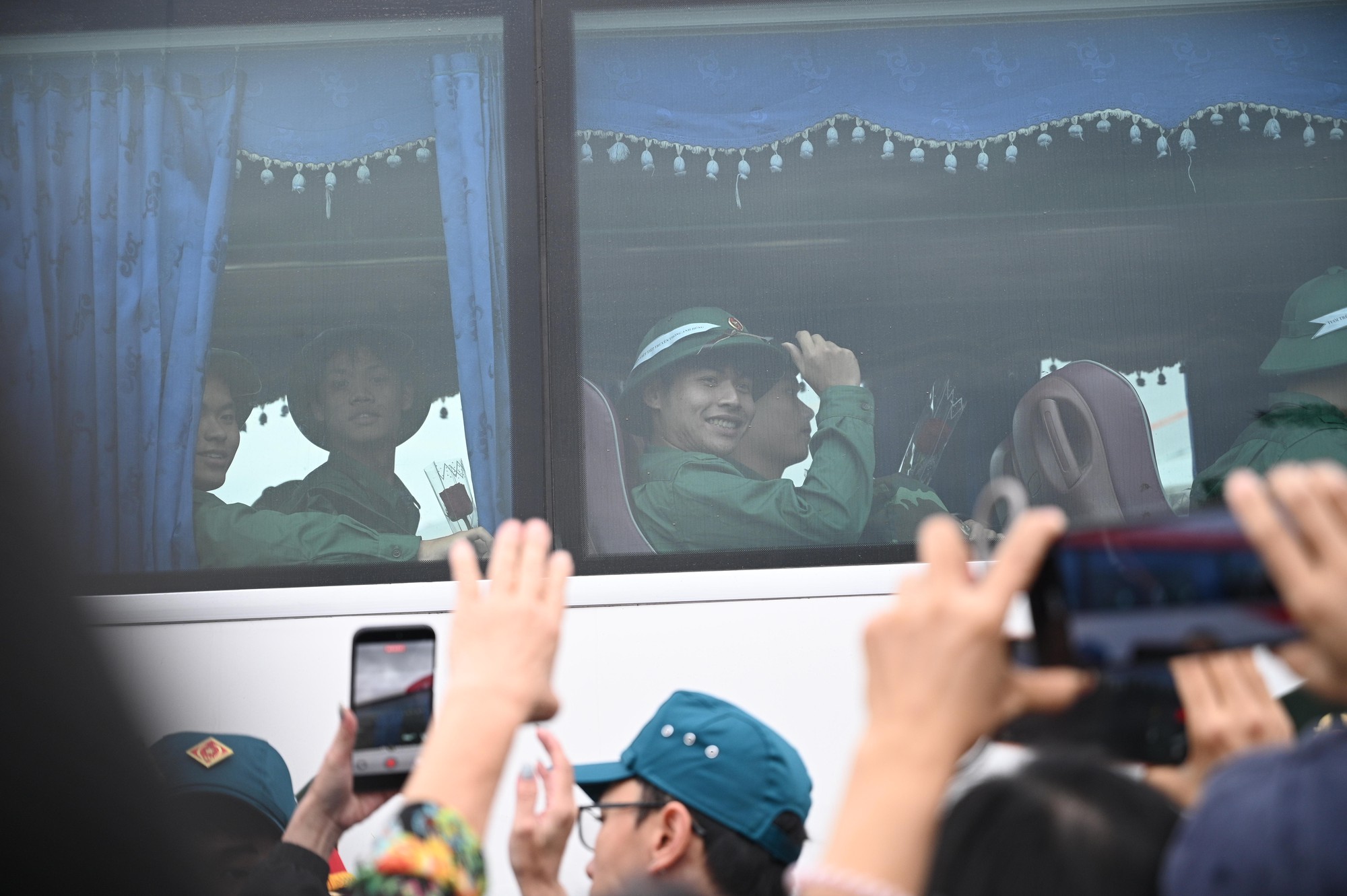 Khoảnh khắc những chuyến xe lăn bánh rời điểm giao quân, nhiều gia đình không giấu được xúc động nhưng vẫn nở nụ cười động viên, tiếp thêm tinh thần cho các chiến sĩ trẻ.