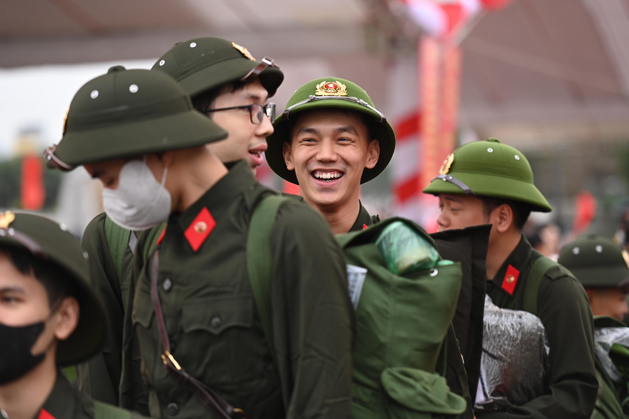 Các tân binh trong bộ quân phục chỉnh tề, gương mặt rạng rỡ, tự tin bước qua cầu vinh quang trong tiếng trống hội và sự cổ vũ của người thân, bạn bè. Nhiều thanh niên chia sẻ niềm tự hào khi được khoác lên mình màu áo lính, coi đây là cơ hội rèn luyện bản lĩnh, ý chí và trưởng thành hơn trong môi trường quân đội.