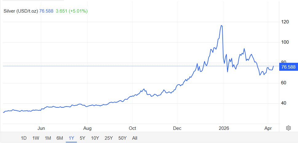 Giá bạc thế giới ghi nhận đà tăng mạnh trong phiên giao dịch ngày 8/4, khi vượt mốc 76 USD/ounce , tăng hơn 4% và lên mức cao nhất trong vòng ba tuần. Diễn biến này diễn ra trong bối cảnh căng thẳng địa chính trị tại Trung Đông có dấu hiệu hạ nhiệt, góp phần cải thiện tâm lý thị trường tài chính toàn cầu.