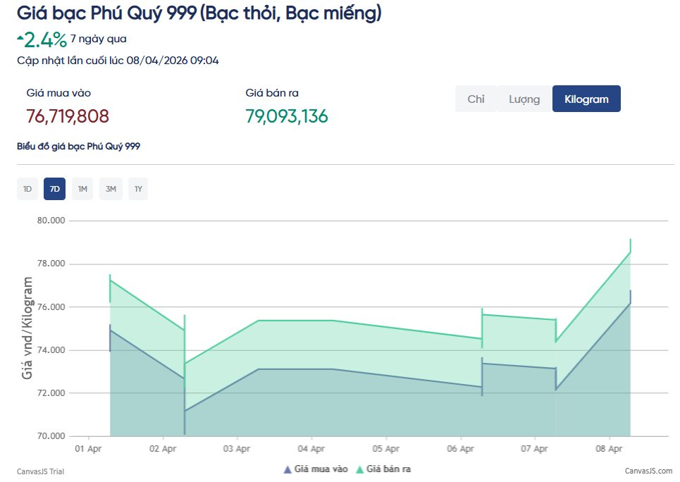 Tại thị trường trong nước, giá bạc cũng ghi nhận xu hướng tăng tương tự. Theo niêm yết của Tập đoàn Vàng bạc Đá quý Phú Quý, giá bạc Phú Quý 999 trong sáng ngày 8/4 được giao dịch ở mức khoảng 76,7 triệu đồng/kg chiều mua vào và 79,09 triệu đồng/kg chiều bán ra . Đây là mức cao nhất trong vòng 3 tuần qua.