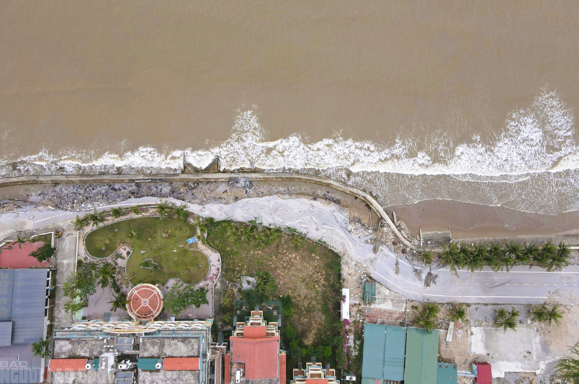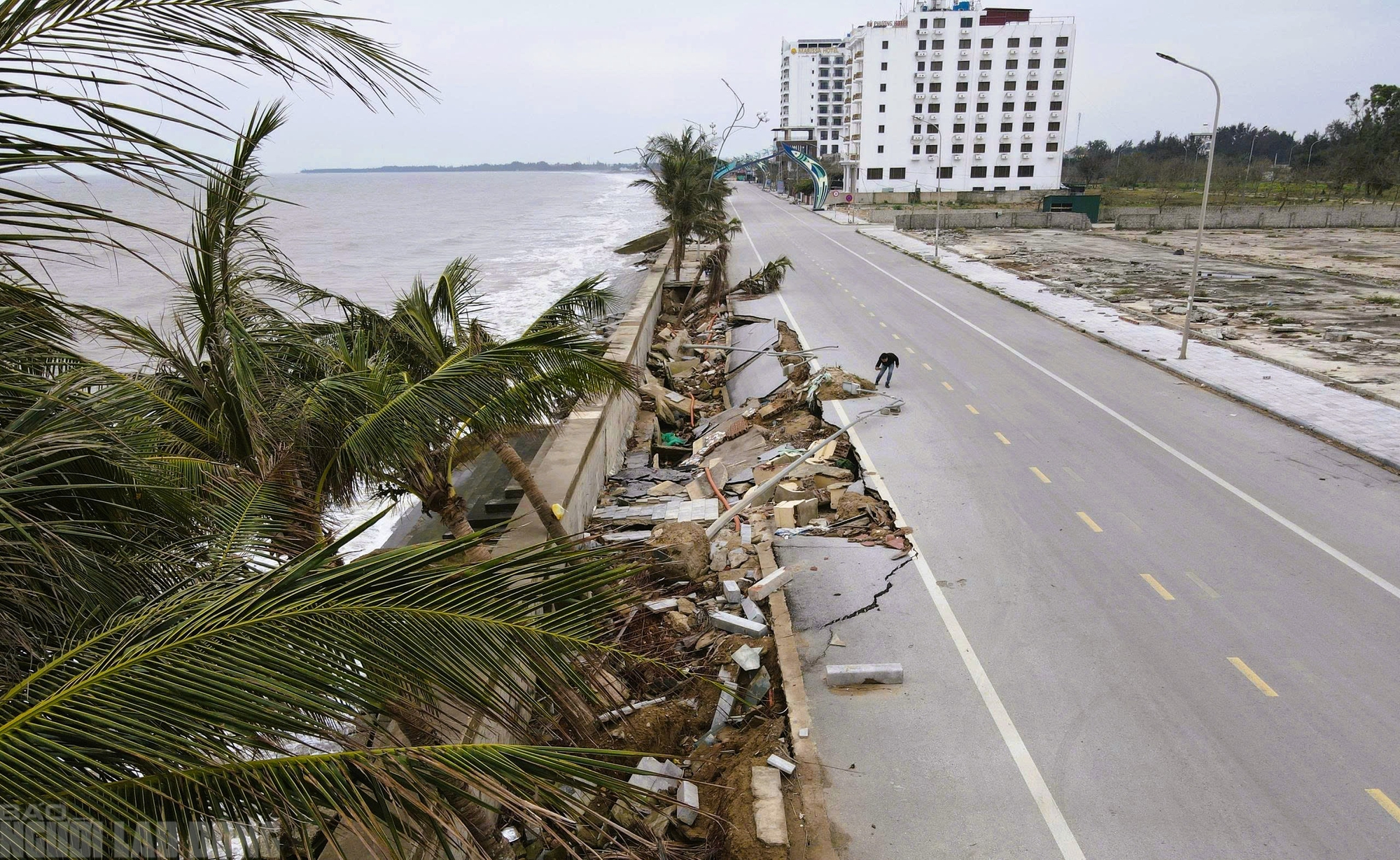 Như Báo Người Lao Động đã phản ánh trước đó, do ảnh hưởng của các cơn bão Kajiki (số 5), Ragasa (số 9), Bualoi (số 10) trong năm 2025, nhiều km bờ kè, đường giao thông dọc bãi biển Hải Tiến - điểm du lịch nổi tiếng ở Thanh Hóa (thuộc 2 xã Hoằng Tiến và Hoằng Thanh) bị sóng biển đánh hư hỏng, sạt lở khắp nơi.