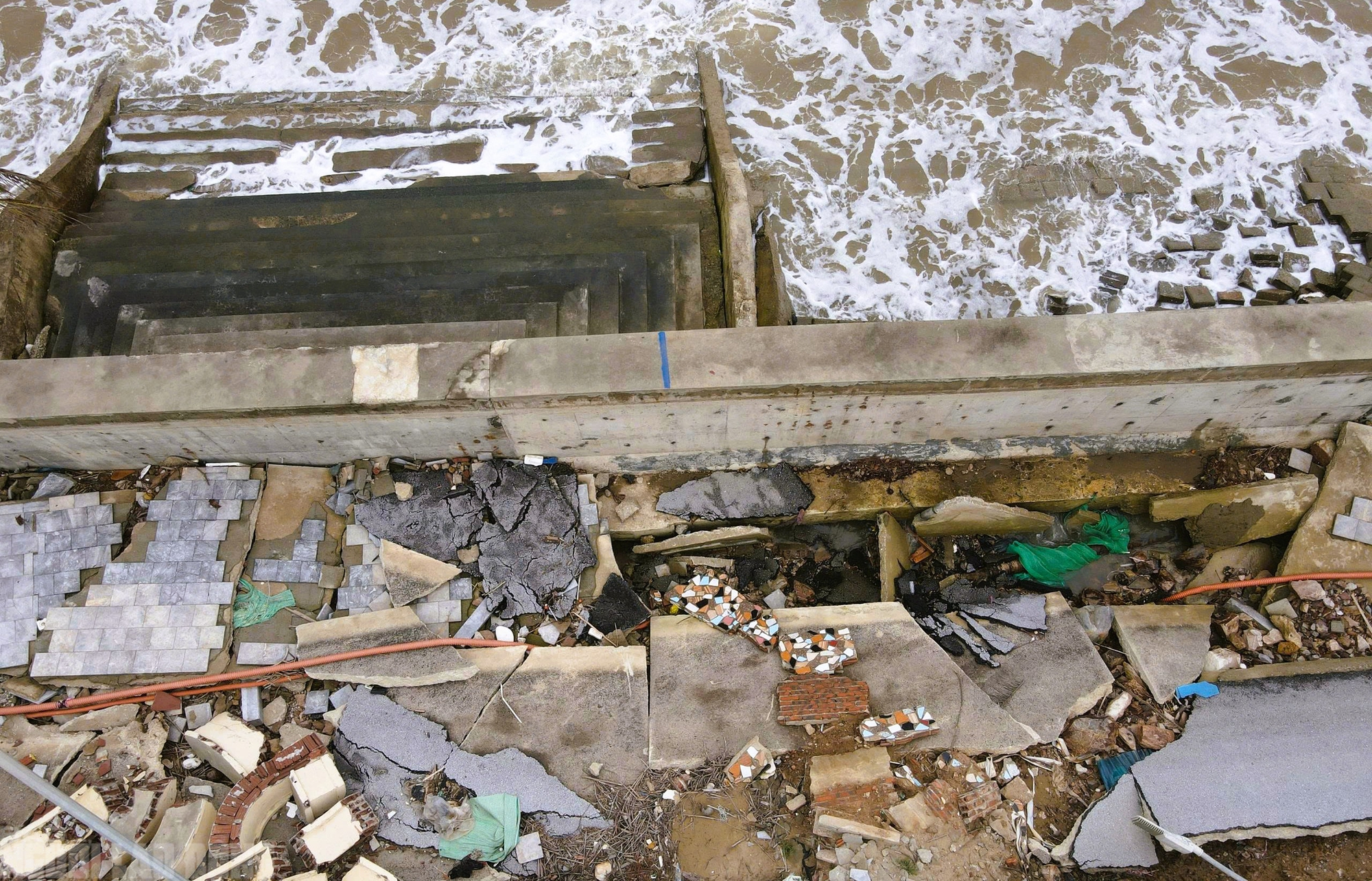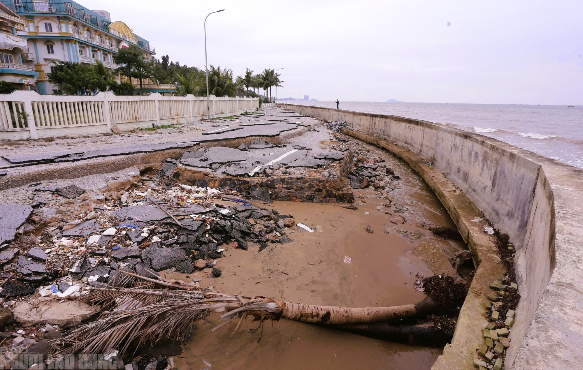 Không chỉ bờ kè, đường giao thông bị đánh tơi tả, dọc bờ biển nhiều nơi rác thải, cây cối do sóng biển cuốn vào cũng chưa được dọn dẹp