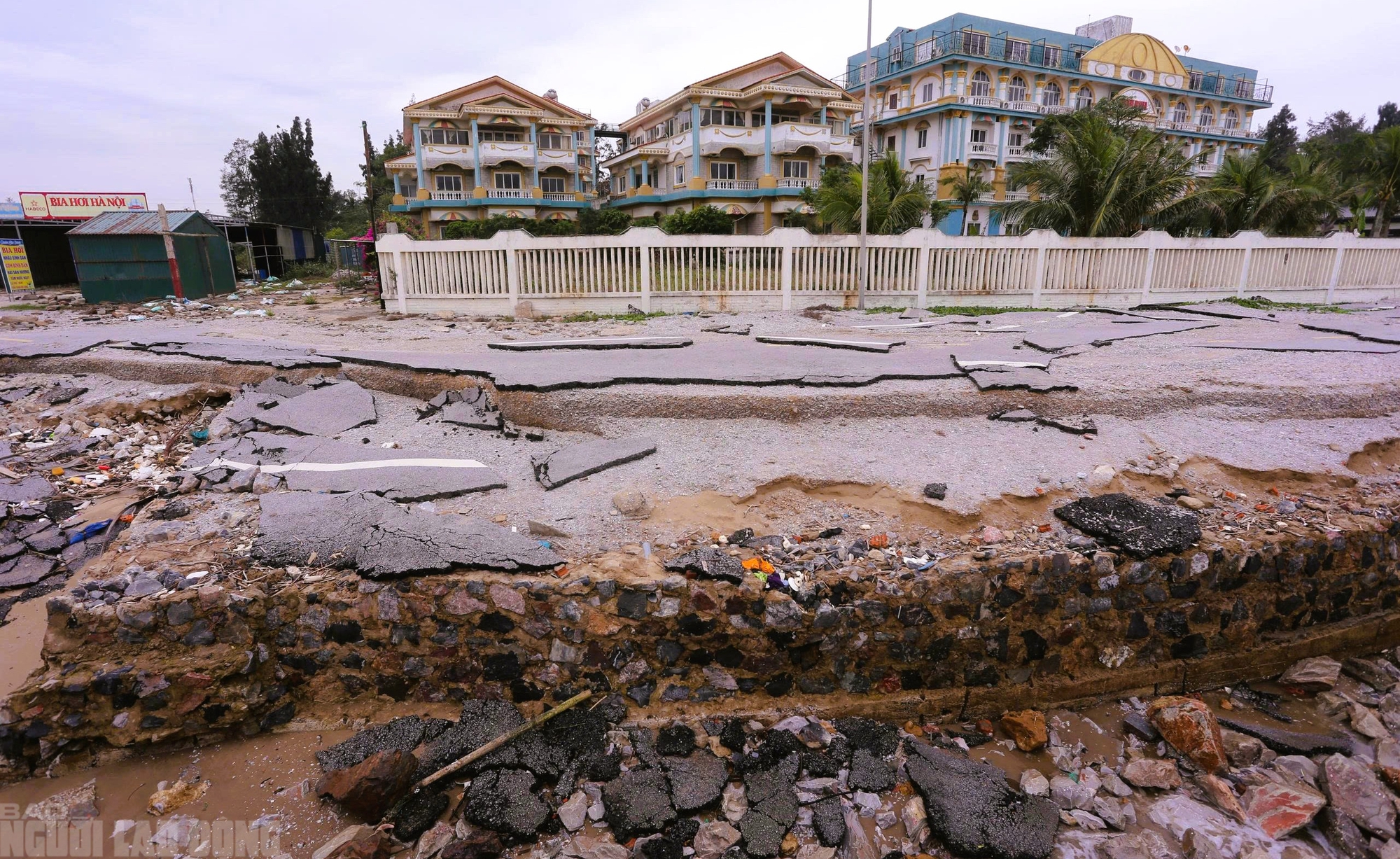 Đường giao thông bị sóng biển đánh tụt sâu, từng mảng nhựa đường bong tróc khắp nơi