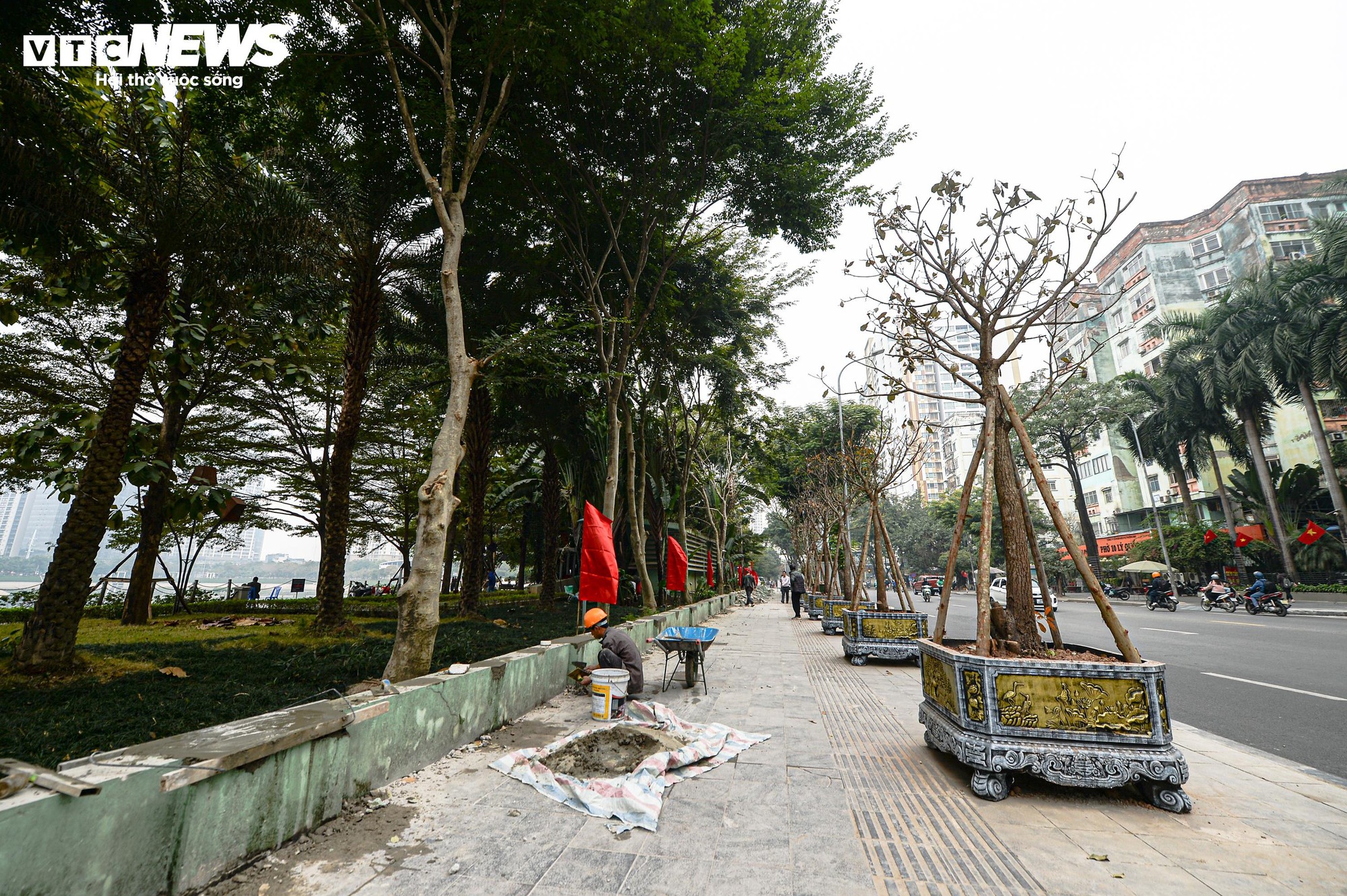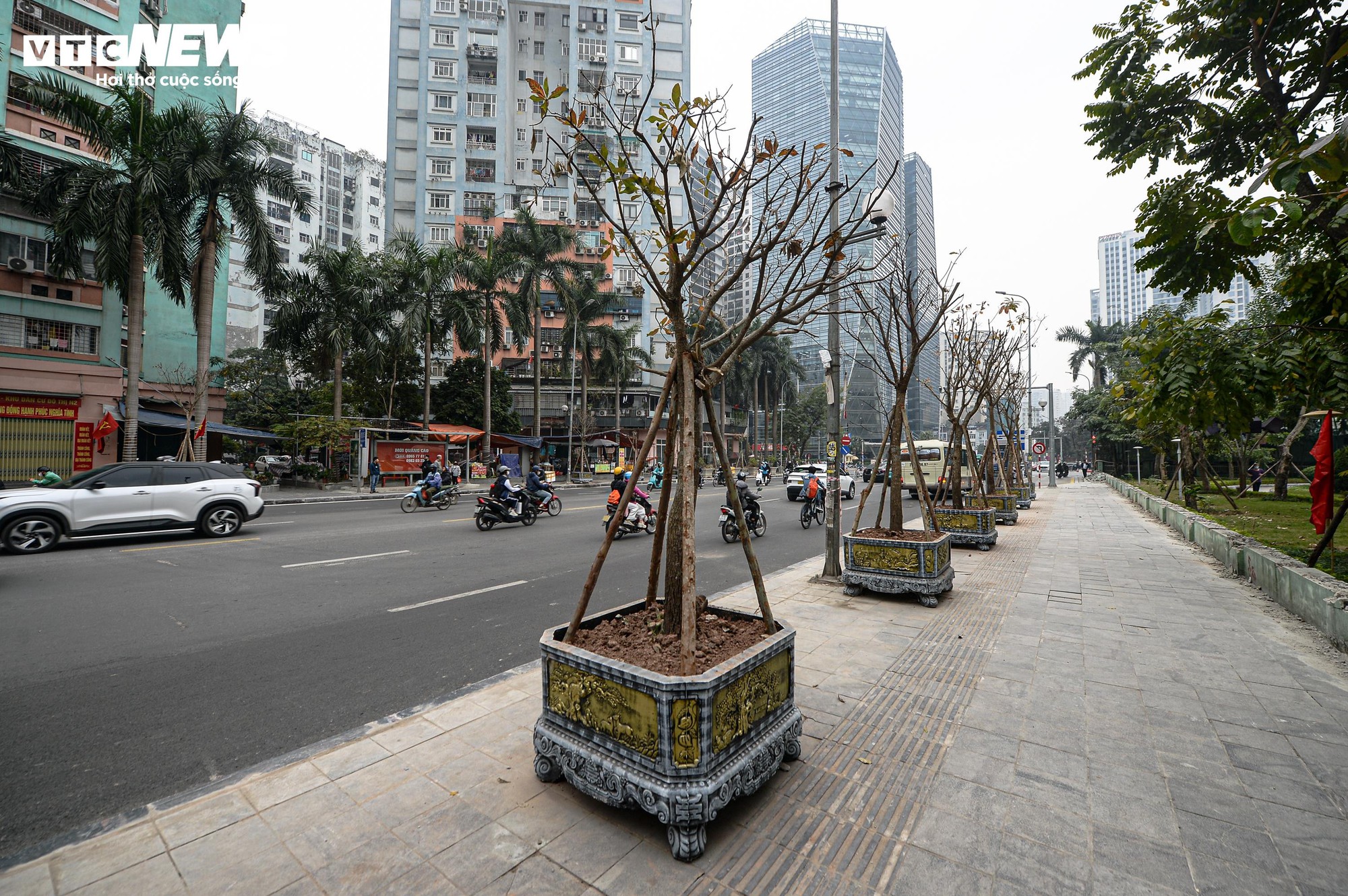 Tuy nhiên, theo ghi nhận, một số chậu cây hiện có dấu hiệu khô héo, đồng thời việc bố trí chưa hợp lý khiến không gian dành cho người đi bộ bị thu hẹp tại một số đoạn vỉa hè.