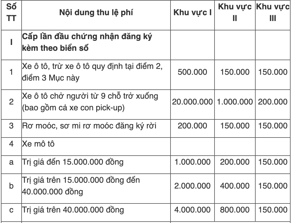Điểm đáng chú ý nhất là việc phân chia các địa phương thành 3 khu vực để áp dụng mức phí khác nhau, thay vì chỉ hai như trước. Theo đó: Khu vực I bao gồm thành phố Hà Nội và TP.HCM. Khu vực II gồm các thành phố trực thuộc Trung ương khác (như Hải Phòng, Đà Nẵng, Cần Thơ), các thành phố thuộc tỉnh và thị xã đã được phân loại đô thị loại I, loại II, loại III. Khu vực III là các địa phương còn lại.