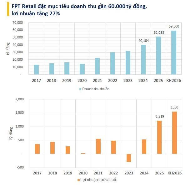 Kế hoạch kinh doanh năm 2026 được xây dựng trên nền tảng tài chính đã ổn định từ năm 2025. Kết thúc năm tài chính vừa qua, FPT Retail ghi nhận doanh thu thuần hợp nhất đạt 51.083 tỷ đồng, tăng 27,4% so với cùng kỳ. Lợi nhuận trước thuế đạt 1.219 tỷ đồng, tăng 131,4%.