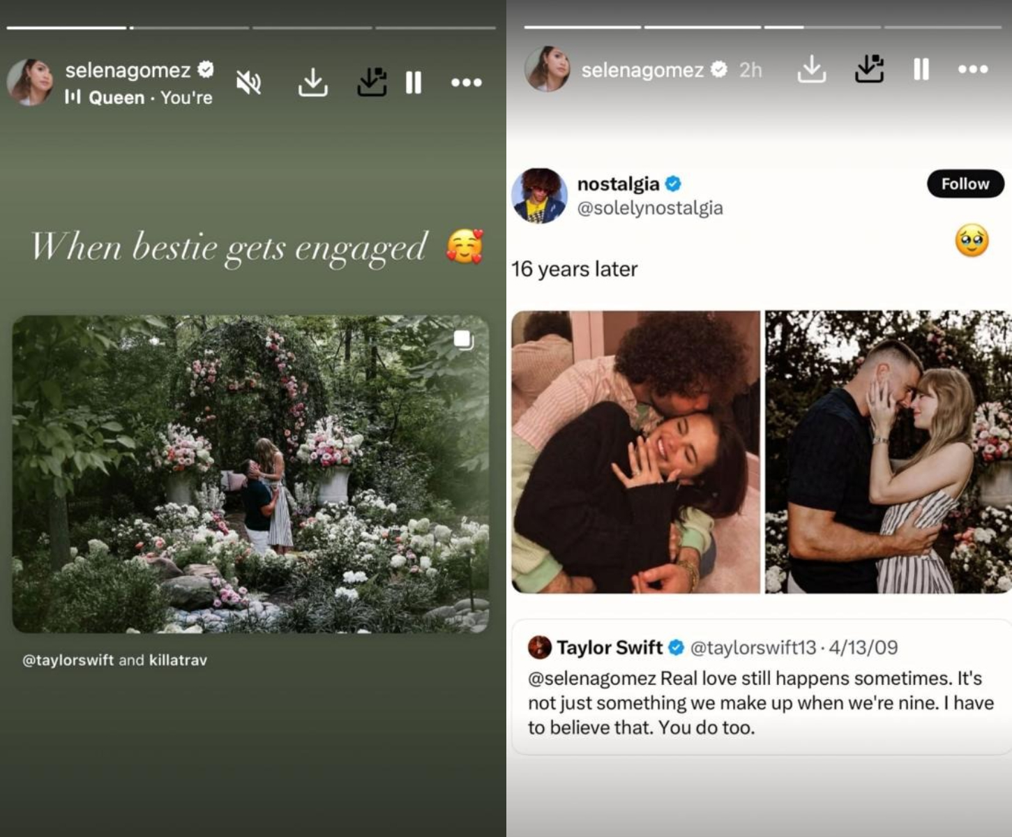 Hạnh phúc càng như nhân đôi lên khi bạn thân của Selena là Taylor Swift cũng thông báo đính hôn với Travis Kelce. Nhiều khả năng Taylor Swift sẽ đóng vai trò quan trọng trong đám cưới của Selena Gomez và ngược lại. Cựu công chúa Disney cũng chúc mừng bạn thân bằng cách chia sẻ lại ảnh Taylor đính hôn và những điều cô viết năm 2009: "Tình yêu đích thực đôi khi vẫn xảy ra. Nó không phải là thứ chúng ta tự bịa ra khi 9 tuổi. Tôi phải tin điều đó. Bạn cũng vậy".