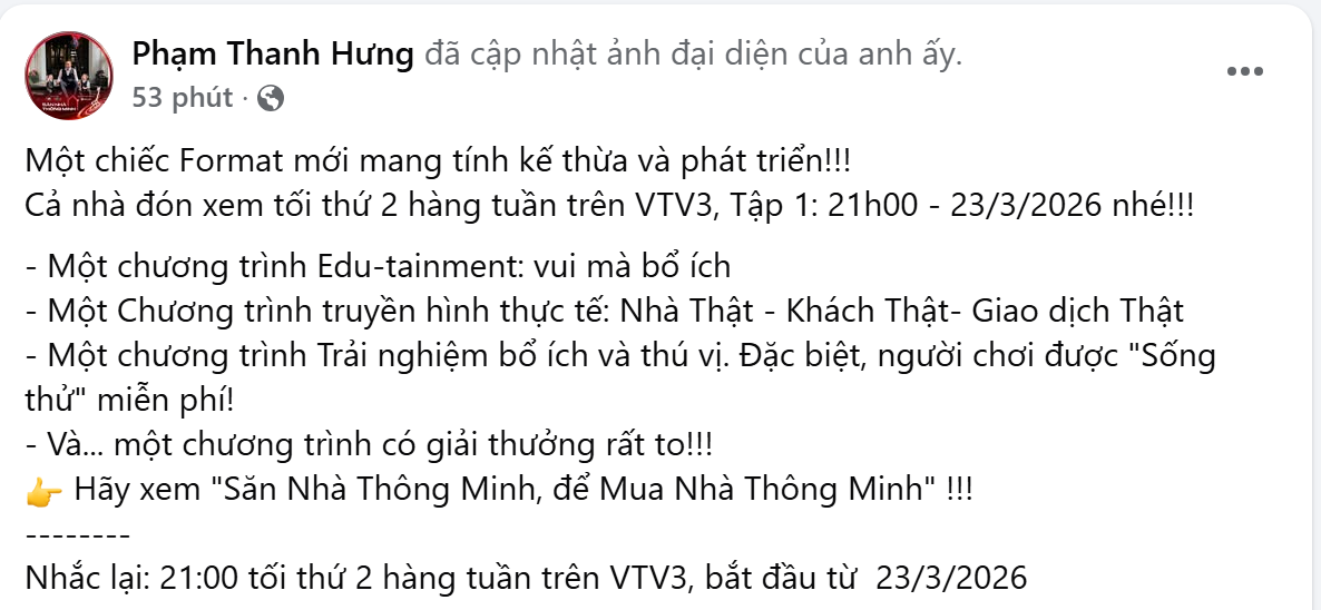 Trên fanpage cá nhân, ông Phạm Thanh Hưng - Phó Chủ tịch HĐQT Cen Group (còn gọi là Shark Hưng) vừa cập nhật bài đăng mới nhất giới thiệu về chương trình "Săn nhà thông minh" sẽ phát sóng trên VTV3 sắp tới.