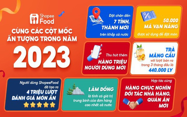 Năm 2023, ShopeeFood ghi nhận mức tăng trưởng ấn tượng về số lượng người dùng, đối tác kinh doanh, tỉnh thành phủ sóng và các gói hỗ trợ thiết thực.