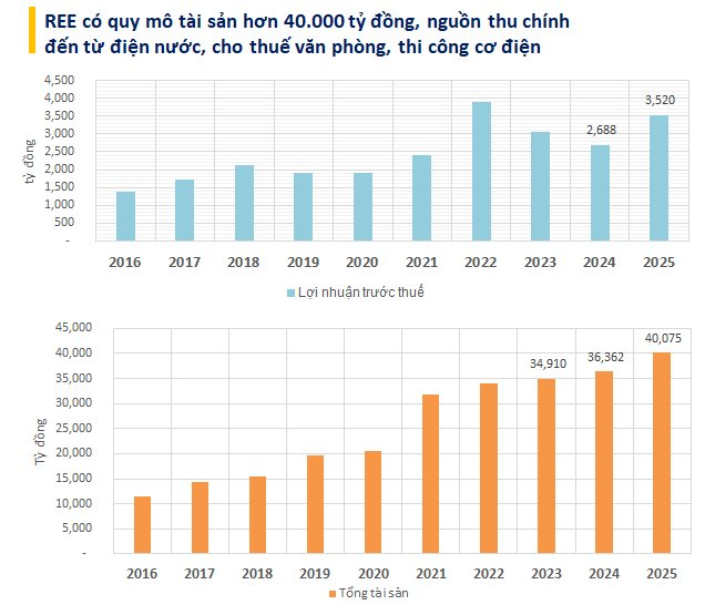 Trong lĩnh vực bất động sản, REE chứng minh năng lực vận hành qua hệ thống tòa nhà văn phòng Etown 1-6 và REE Tower. Doanh nghiệp cũng mở rộng sang phân khúc nhà ở với dự án Bồ Xuyên tại Thái Bình và chuẩn bị khởi công cao ốc văn phòng Phú Hữu tại TP. HCM. Năm 2025, doanh nghiệp ghi nhận lợi nhuận sau thuế đạt 3.149 tỷ đồng. Tính đến cuối kỳ báo cáo, lượng tiền mặt và tiền gửi ngân hàng duy trì ở mức 6.000 tỷ đồng, đảm bảo khả năng đối ứng vốn cho dự án.