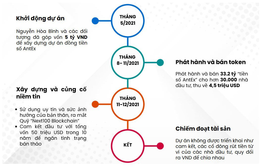Từ tháng 11/2021 đến tháng 12/2021, Shark Bình đã sử dụng uy tín và tầm ảnh hưởng của bản thân để đăng tải thông tin trên mạng xã hội về việc ra mắt Quỹ đầu tư “Next100 Blockchain" và cam kết đầu tư vào các dự án đồng tiền số với tổng số vốn là 50 triệu USD trong 10 năm nhằm quảng bá đồng tiền số AntEx và củng cố niềm tin của các nhà đầu tư, tránh xảy ra tình trạng bán tháo đồng tiền AntEx (gây sụt giảm giá trị đồng tiền) để rút vốn khỏi dự án.