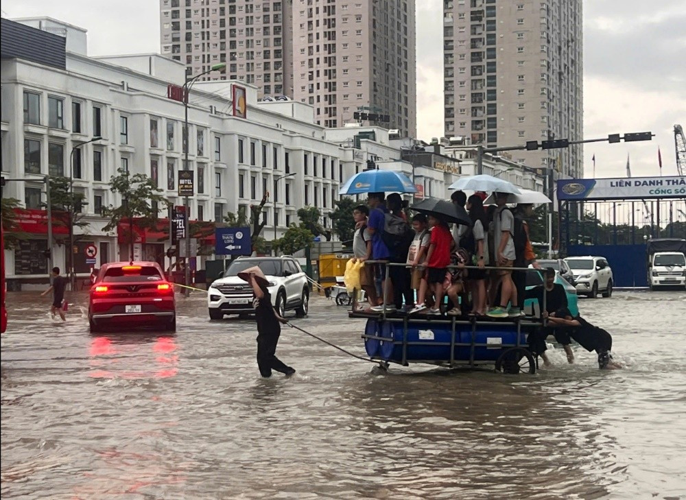 Học sinh Hà Nội phải nhờ đến phương tiện vận chuyển qua chỗ ngập trong bão số 10 vừa qua.
