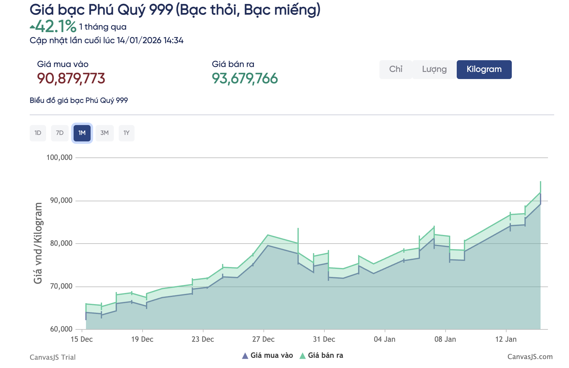 Giá bạc kg cũng khiến nhiều người giật mình. Tập đoàn Phú Quý bán ra 1 kg bạc kg tới 93,62 triệu đồng, trong khi SBJ bán 93,48 triệu đồng. Mức đỉnh trong ngày được ghi nhận lên tới 94,2 triệu đồng, tăng hơn 12 triệu đồng chỉ trong một tuần.