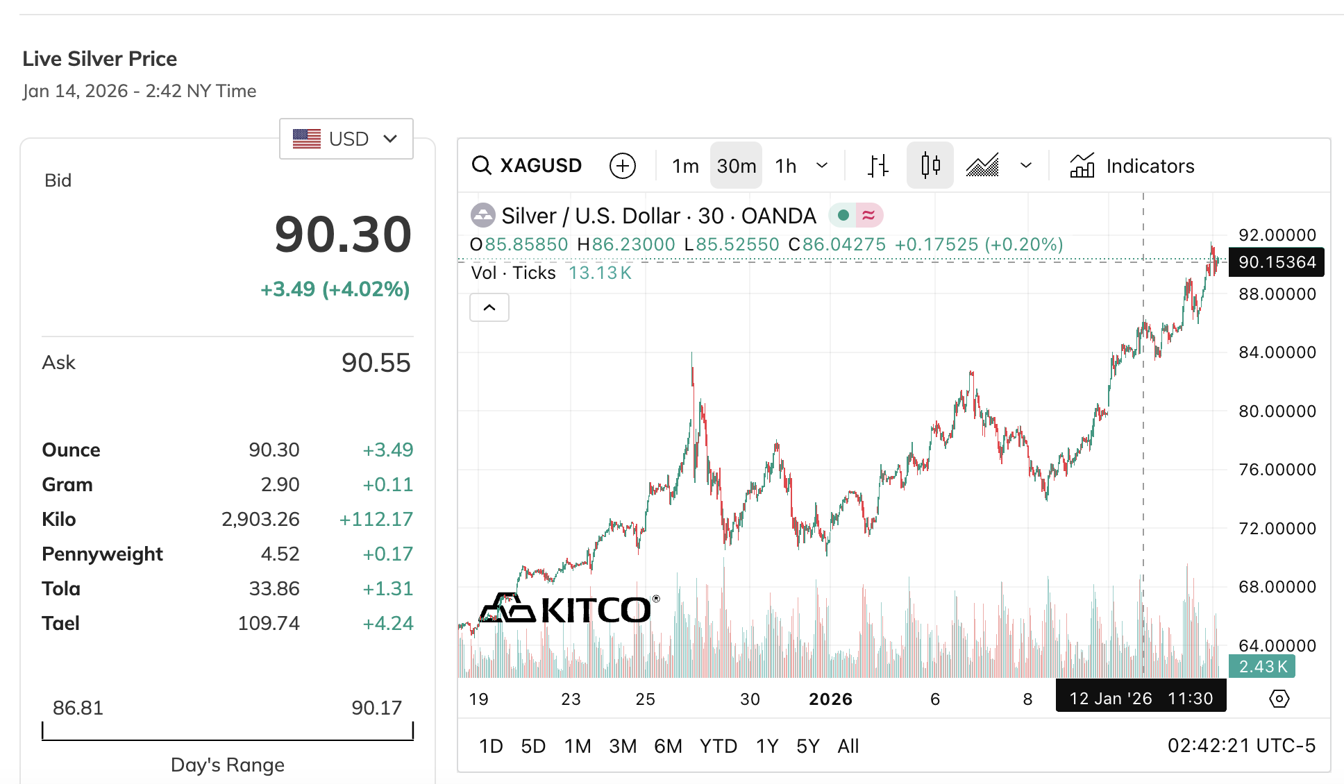 Giá bạc trong nước tăng vọt theo đà dậy sóng của giá thế giới. Mốc đỉnh mới hiện được ghi nhận lên tới trên 90 USD/ounce, tăng gần 4% so với phiên trước. Thậm chí, đà tăng của giá bạc thế giới còn nhanh hơn bạc trong nước và bỏ xa mức tăng của giá vàng. Chỉ trong 1 tuần, giá bạc tăng từ 74 USD/ounce lên vượt 90 USD/ounce (+21,6%), mốc cao nhất từ trước tới nay.