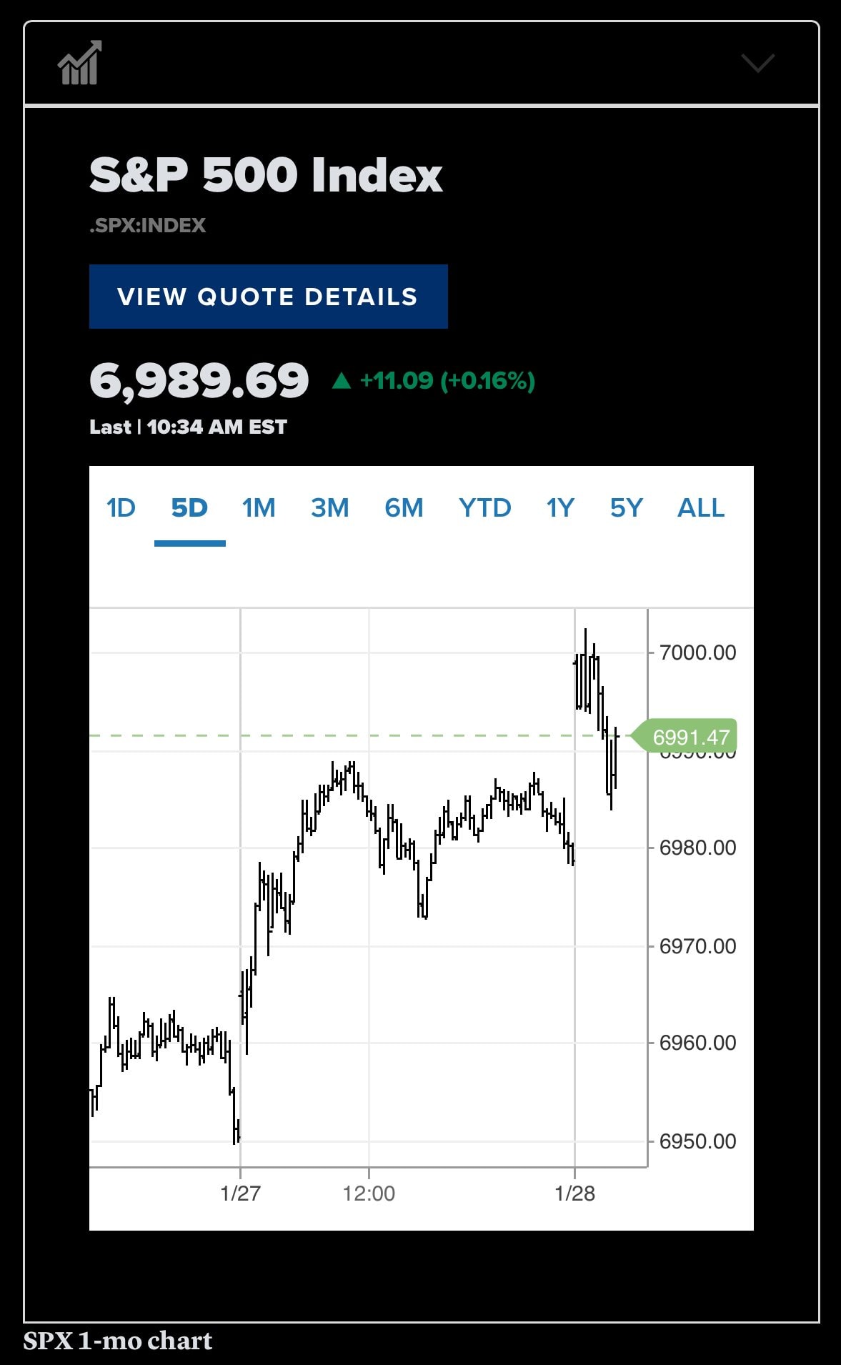 Chứng khoán Mỹ tăng điểm trong phiên giao dịch ngày 27/1. Chỉ số S&P 500 lần đầu tiên trong lịch sử chạm mốc 7.000 điểm, khi giới đầu tư chờ đợi quyết định lãi suất của Cục Dự trữ Liên bang Mỹ (Fed) và loạt báo cáo kết quả kinh doanh từ các tập đoàn công nghệ lớn.
