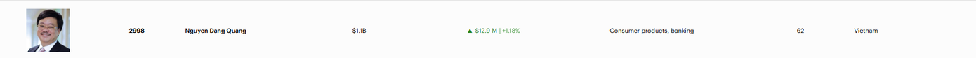 Sau khi bị loại khỏi danh sách vào tháng 3, ông Quang đã quay trở lại chỉ sau vài tháng và kết thúc năm với mức tăng tài sản khoảng 100 triệu USD. Hiện ông sở hữu hơn 31% cổ phần Masan Group cùng lượng cổ phiếu đáng kể tại Techcombank, cho thấy sức bật đáng kể của hệ sinh thái tiêu dùng - bán lẻ trong bối cảnh thị trường nhiều biến động.