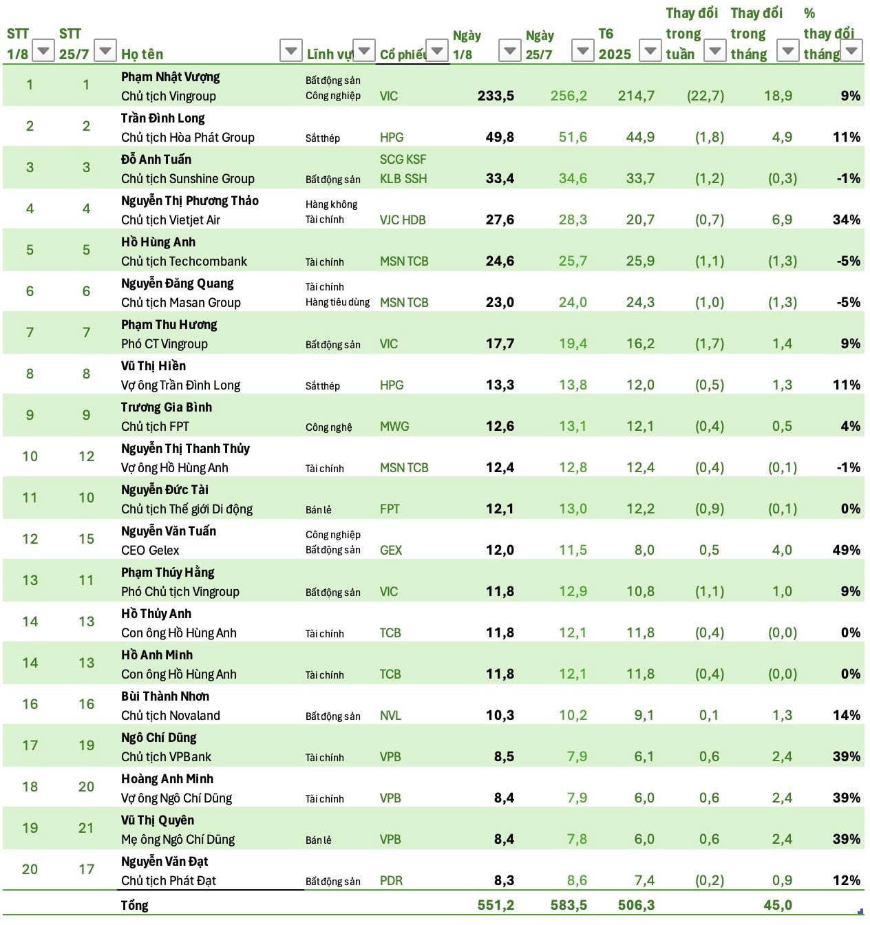 Tính đến ngày 1/8, tổng tài sản của 20 người giàu nhất sàn chứng khoán Việt Nam đạt 551.200 tỷ đồng, giảm 32.100 tỷ đồng so với thời điểm ngày 25/7.