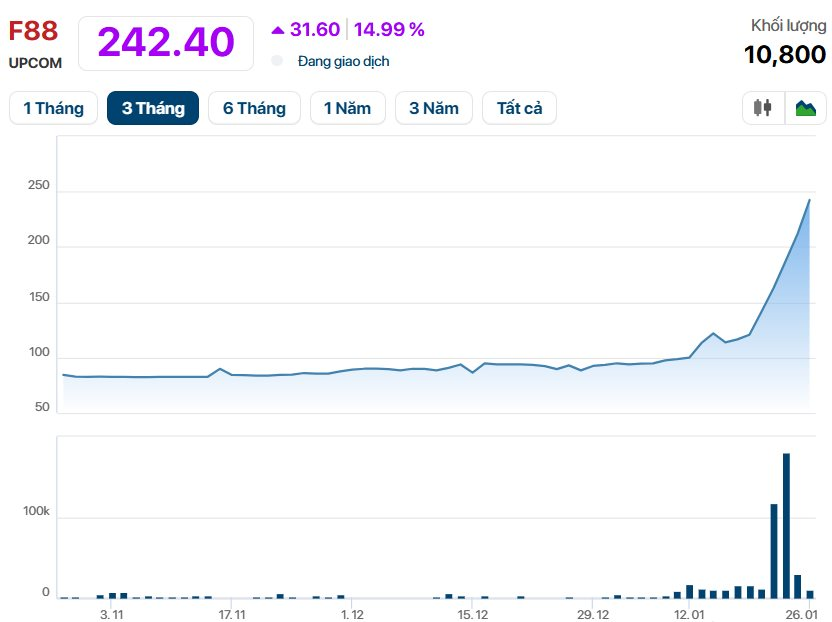 Ngay lập tức, F88 đã tăng trần liên tục và buổi sáng ngày 26/1/2026 ghi nhận phiên tăng trần phiên thứ 5 liên tiếp với mức tăng mỗi phiên là 15% trên sàn Upcom.
