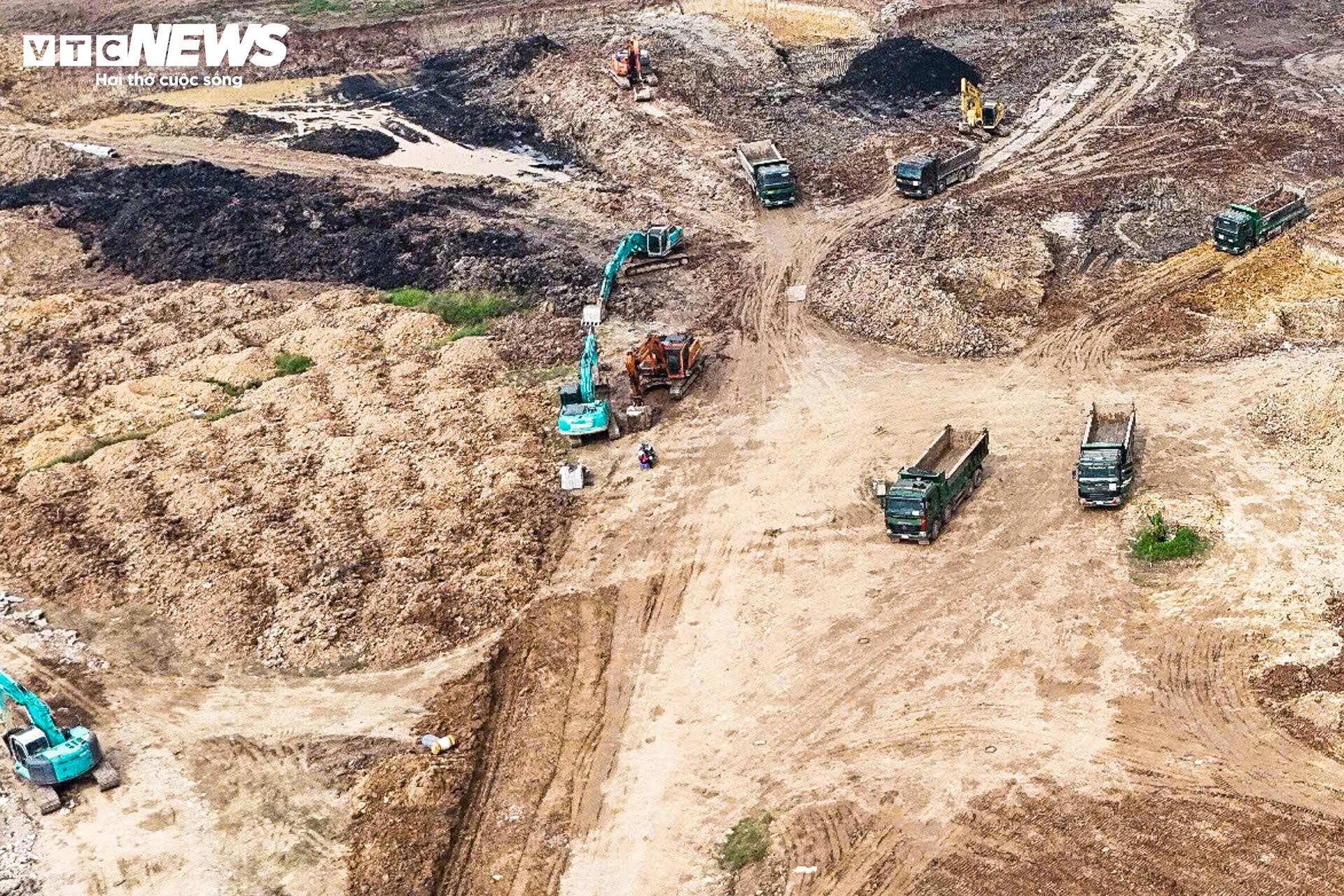 Bên trong khu vực dự án, nhiều máy xúc và xe tải hoạt động liên tục. Các mũi thi công được bố trí tại nhiều vị trí nhằm đẩy nhanh tiến độ san lấp và đào đất.