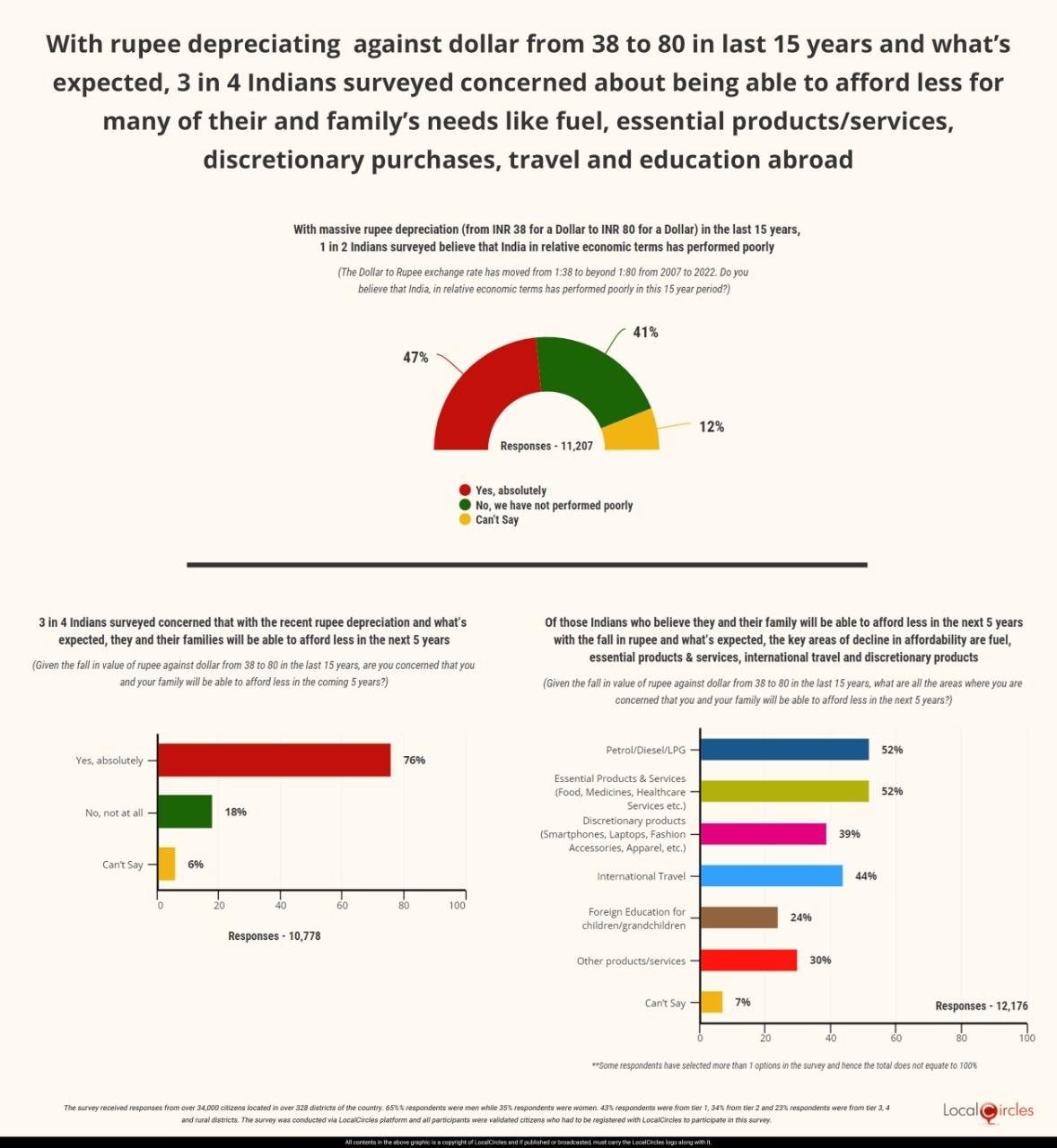 Khảo sát của LocalCircles cho thấy 3 trong 4 người dân lo ngại cuộc sống sẽ khó khăn hơn trong 5 năm tới, với xăng dầu, thực phẩm và thuốc men là ba khoản chi tăng mạnh nhất. Hơn 50% người tham gia chỉ ra những khoản tăng chi đáng lo ngại gồm xăng dầu, thực phẩm, thuốc men, và các dịch vụ y tế—những nhu cầu thiết yếu của gia đình.