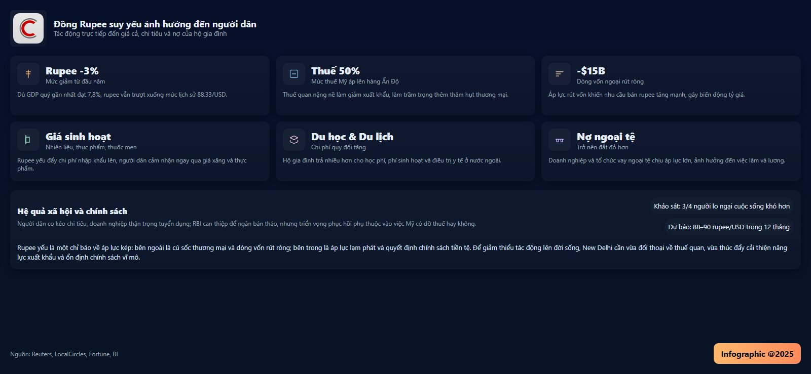 Đồng Rupee yếu không chỉ là vấn đề tỷ giá, mà phản ánh toàn bộ áp lực của nền kinh tế Ấn Độ trước môi trường toàn cầu biến động. Khi thương mại bị bóp nghẹt, vốn ngoại rút lui và niềm tin nhà đầu tư suy giảm, chính sách ổn định vĩ mô trở nên khó khăn hơn.