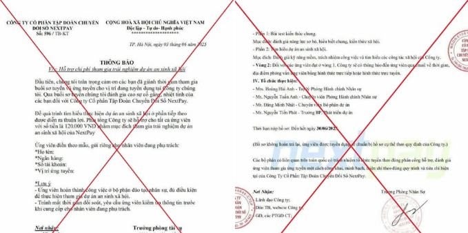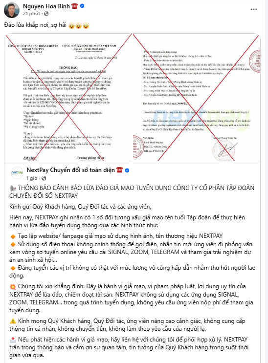 -Chúng tôi xin khẳng định: Đây là hành vi giả mạo, vi phạm pháp luật, lợi dụng uy tín của NEXTPAY để lừa đảo, chiếm đoạt tài sản. NEXTPAY không sử dụng các ứng dụng SIGNAL, ZOOM, TELEGRAM... trong quá trình tuyển dụng, không yêu cầu ứng viên nộp phí để tham gia tuyển dụng.