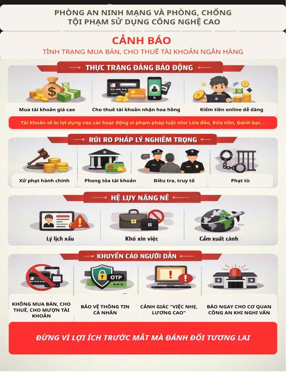Trước tình hình trên, cơ quan công an khuyến cáo người dân cần nâng cao cảnh giác, tuyệt đối không cho thuê, cho mượn hoặc mua bán tài khoản ngân hàng dưới bất kỳ hình thức nào nhằm tránh tiếp tay cho tội phạm và tự đẩy mình vào vòng lao lý.