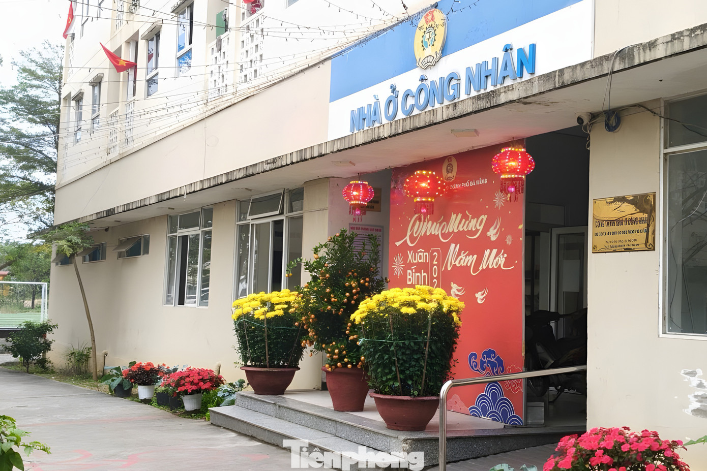 Khu nhà ở công nhân Khu công nghiệp Hòa Cầm (phường Cẩm Lệ) những ngày này cũng ngập sắc xuân. Ở sảnh, tấm pano chào xuân với tông màu đỏ rực đã được dựng lên cả tuần này, thêm đôi chậu cúc mâm xôi, cây quất, đèn lồng đỏ, thế là Tết.