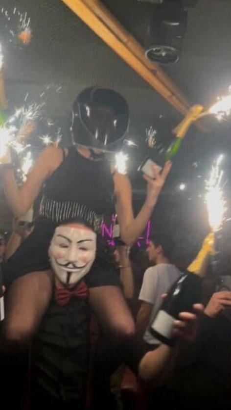 Bức ảnh cho thấy một cô gái trẻ đang ngồi trên vai một người đàn ông, tay cầm những chai sâm panh có pháo sáng hướng lên gần trần nhà.