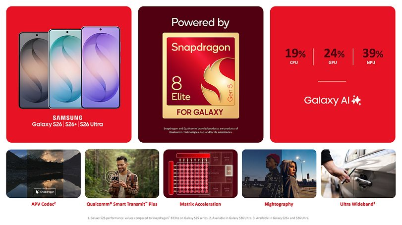 Mối quan hệ hợp tác giữa Qualcomm và Samsung đã duy trì hơn hai thập kỷ qua. Trong chu kỳ sản phẩm mới, Snapdragon 8 Elite Gen 5 for Galaxy được xác nhận sẽ trang bị cho Galaxy S26 Ultra trên phạm vi toàn cầu, cùng các phiên bản S26 và S26+ tại một số thị trường cụ thể.