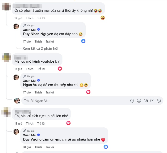 Xuân Mai còn tích cực tương tác và trả lời bình luận của khán giả. Khi một người hâm mộ bày tỏ: "Chị Xuân mai đã trở lại mạng xã hội rồi. Em rất hâm mộ chị và thích nghe nhạc của chị khi em còn rất nhỏ", Xuân Mai liền đáp lại: "Cảm ơn em nhiều nhé, chúc gia đình em vui, khỏe!".