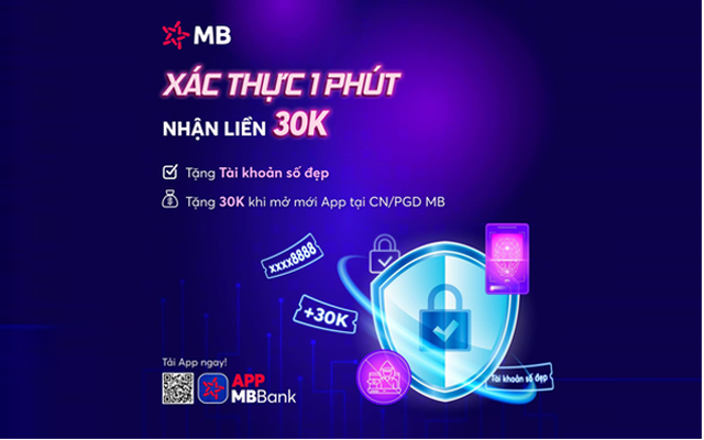 Để khuyến khích khách hàng trẻ tuổi sử dụng dịch vụ của mình, MB đang triển khai chương trình ưu đãi hấp dẫn. Khi mở mới tài khoản App MBBank và hoàn tất xác thực sinh trắc học, khách hàng sẽ nhận được 01 voucher tài khoản số đẹp và 30.000 VNĐ trực tiếp vào tài khoản.