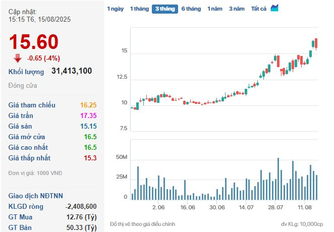 Tính từ cuối tháng 6/2025, cổ phiếu EVF đã có đà tăng bứt phá, thị giá tăng hơn 54%, tương ứng tăng 5.500 đồng/cổ phiếu. Vốn hóa thị trường của EVN Finace tăng mạnh lên mức hơn 11.864 tỷ đồng.