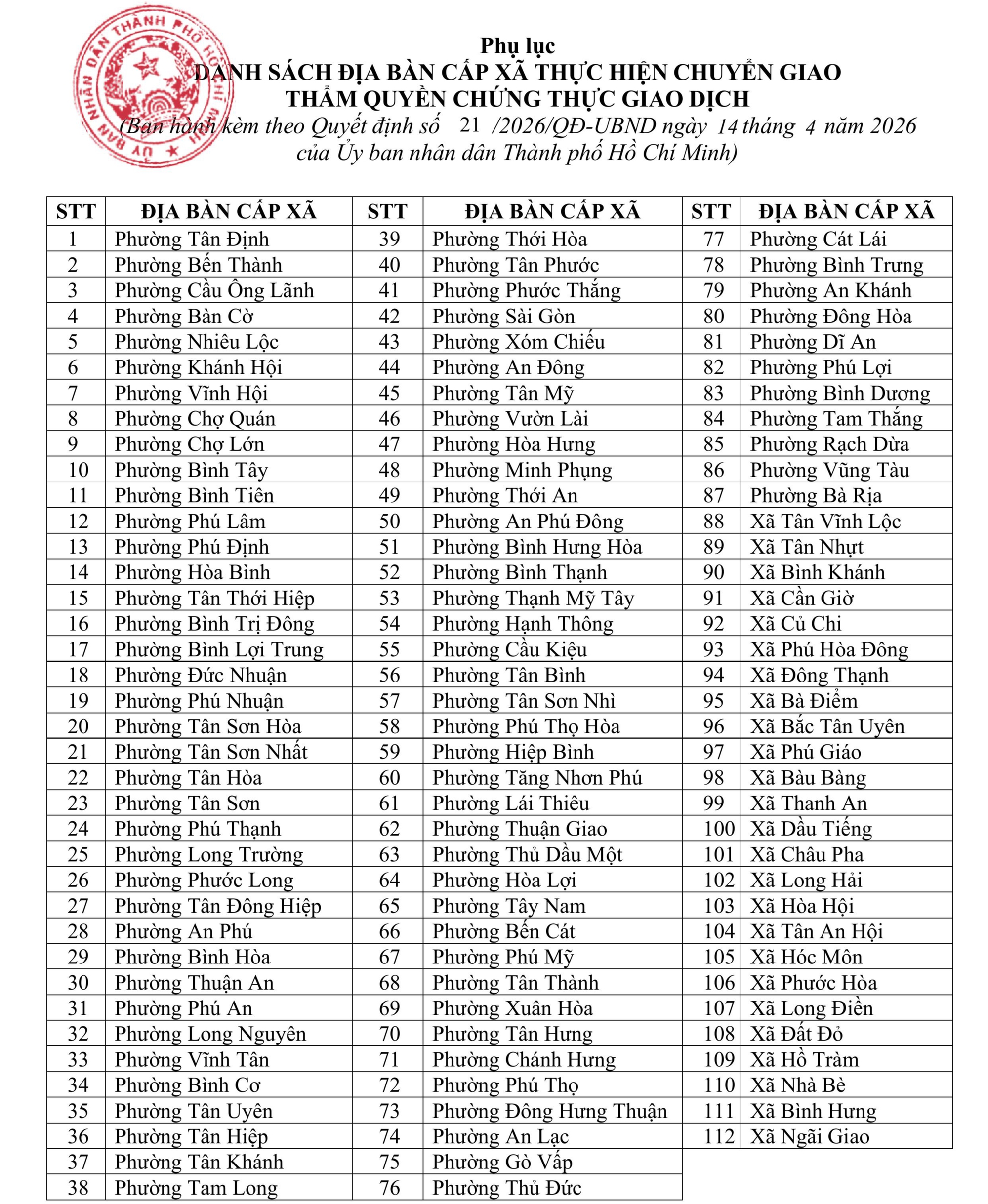 Theo quyết định, có 112 địa phương trong tổng số 168 phường, xã, đặc khu của TPHCM được thực hiện chuyển giao thẩm quyền chứng thực giao dịch