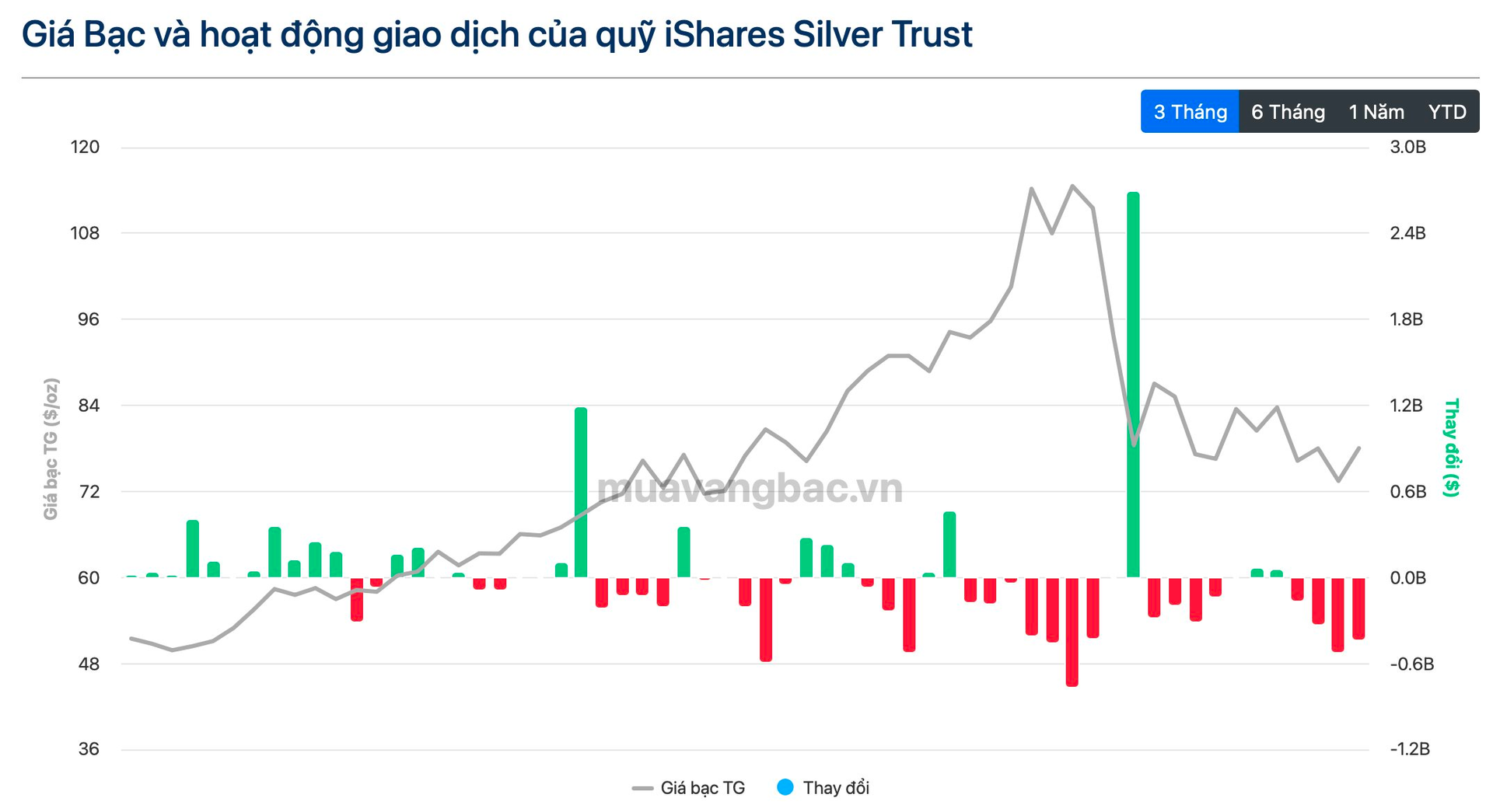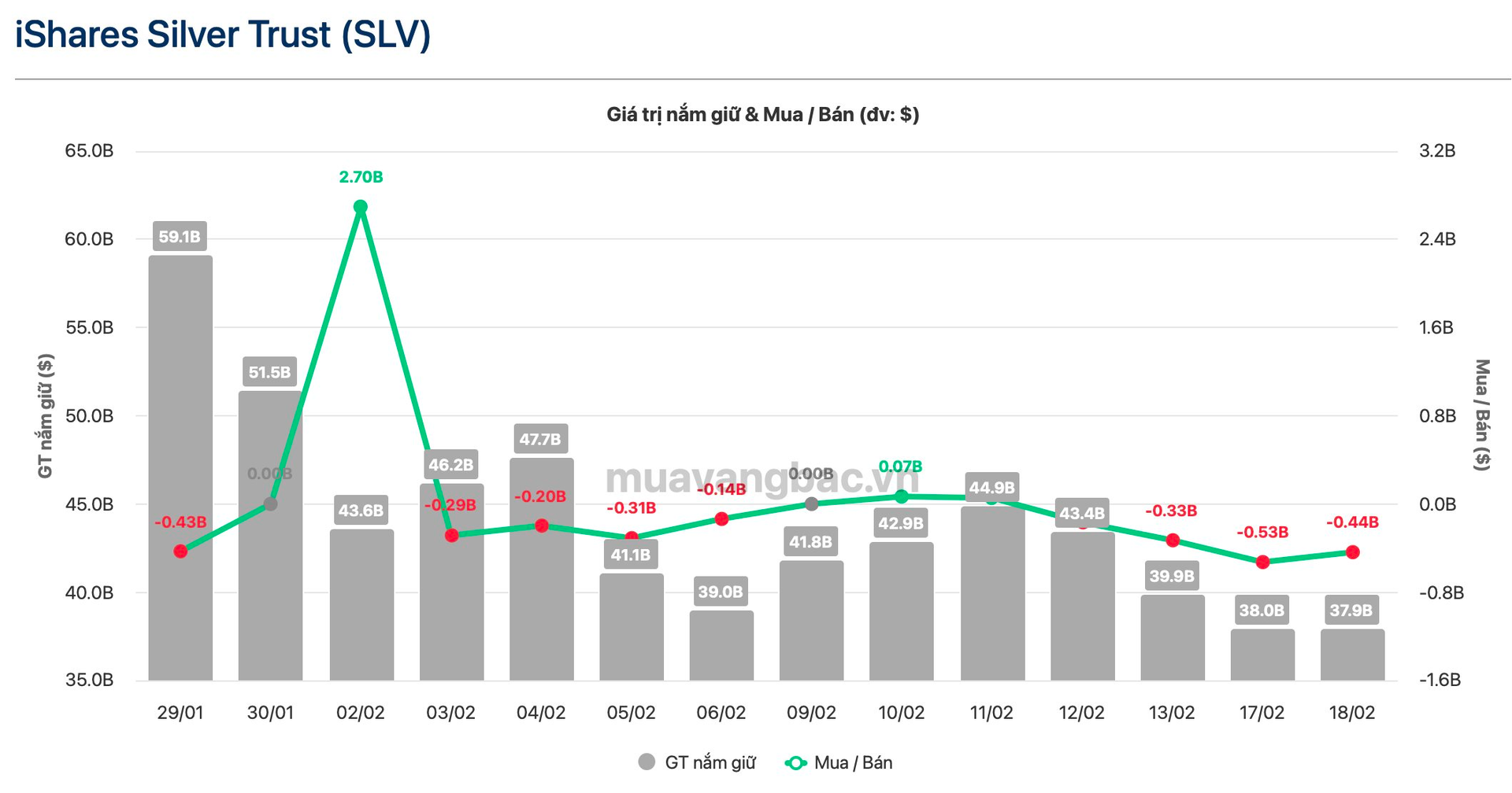 Theo dữ liệu cập nhật từ muavangbac.vn, iShare Silver Trust (SLV) do BlackRock quản lý tiếp tục bán ra 440 triệu USD (khoảng 180 tấn bạc) trong ngày 18/2. Đây là ngày thứ 4 liên tiếp quỹ bạc lớn nhất thế giới bán ra, với tổng khối lượng lên đến hơn 600 tấn. Tính đến ngày 18/2, SLV còn nắm 15.600 tấn bạc, tương ứng quy mô khoảng 37,9 tỷ USD.