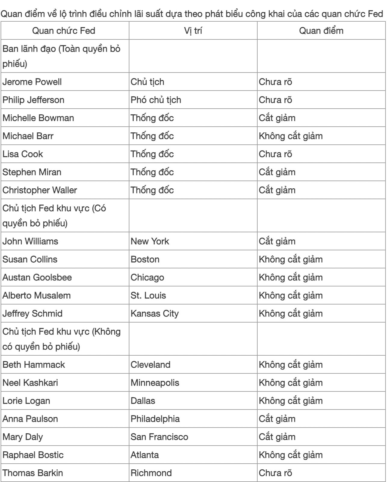 Tuy nhiên, một nhóm quan chức khác trong nội bộ Fed đang ngày càng lo ngại về áp lực giá cả. Họ cho rằng lạm phát vẫn cao do giá hàng hóa chịu tác động của thuế quan và chi phí dịch vụ trong nước đều tăng, cho thấy áp lực giá có thể đang lan rộng. Những người này cảnh báo rằng nếu Fed giảm lãi suất quá nhanh, họ sẽ khó xoay sở nếu nền kinh tế tăng tốc trở lại trong năm tới.