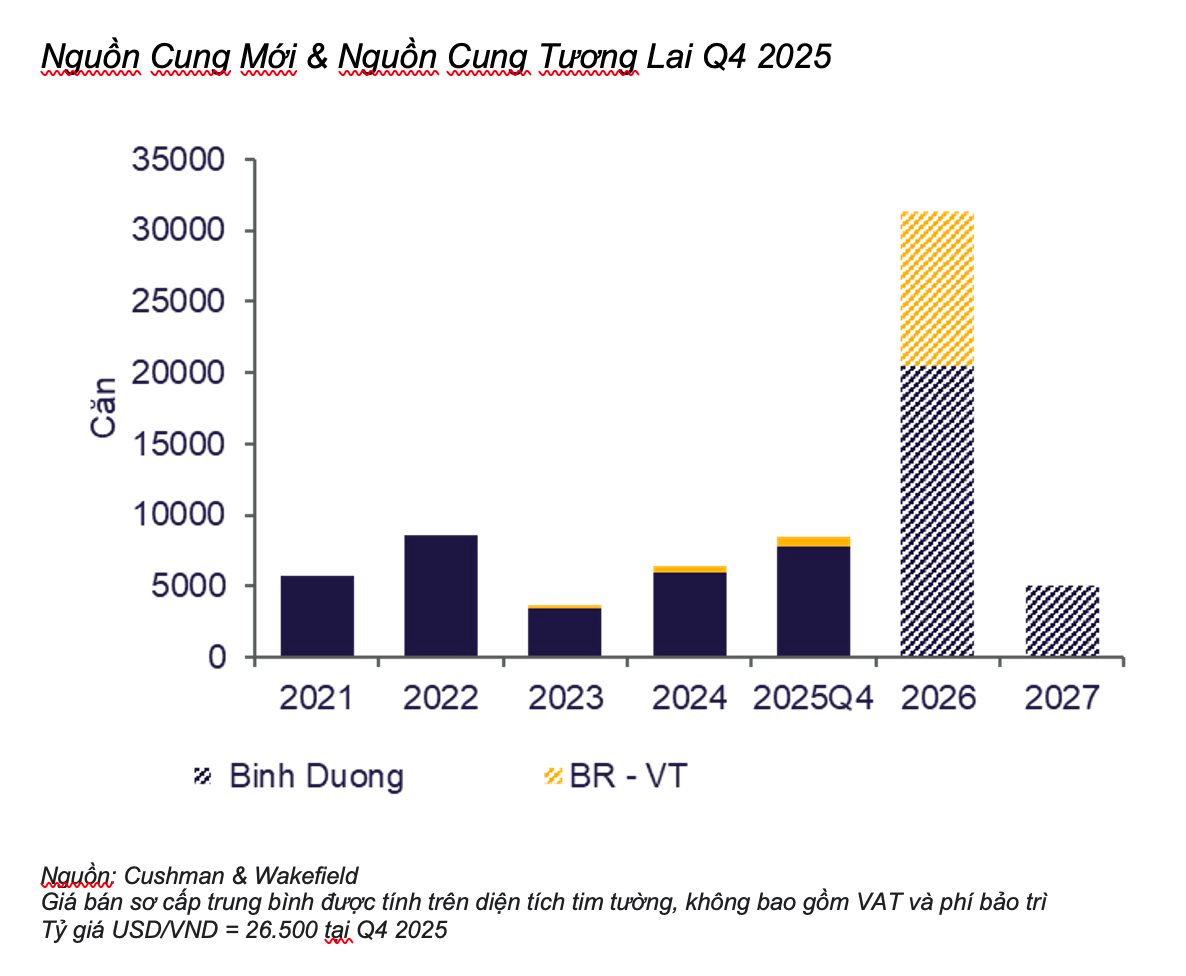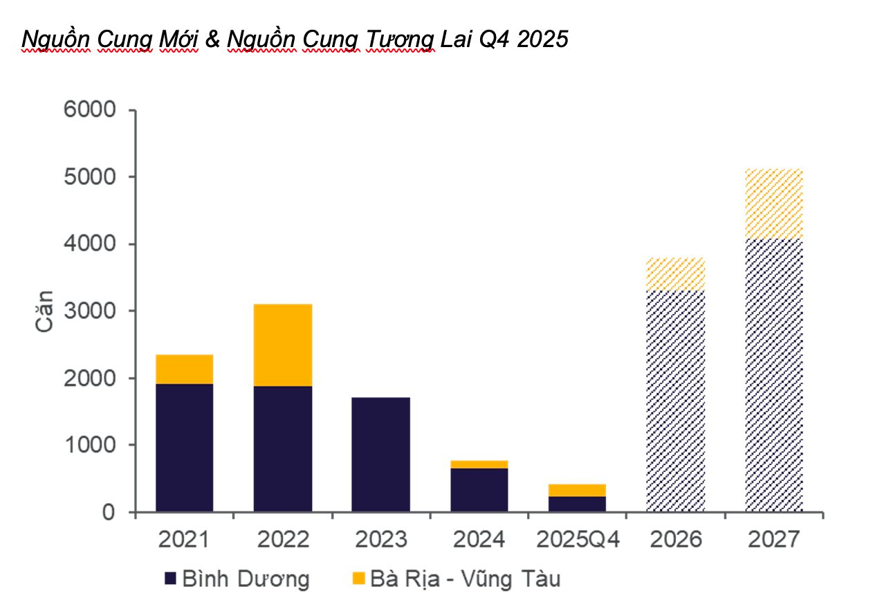 Q4/2025 chứng kiến Bình Dương dẫn đầu nguồn cung căn hộ với gần 17.000 căn sơ cấp, giá bán tiếp tục đi lên nhờ lực cầu ổn định. Trong khi đó, Bà Rịa – Vũng Tàu nổi bật ở phân khúc liền thổ với nguồn cung và giao dịch cùng tăng mạnh, củng cố kỳ vọng chu kỳ tăng trưởng mới.