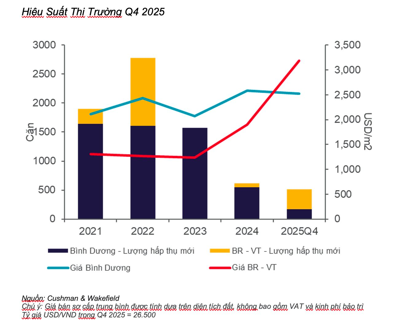 Theo báo cáo Thị trường Nhà ở TP.HCM MarketBeat Q4/2025 do Cushman & Wakefield vừa công bố, Q4/2025 ghi nhận sự phân hóa rõ nét tại các thị trường nhà ở khu vực vệ tinh của TP.HCM, trong đó Bình Dương (cũ) dẫn đầu về nguồn cung và lượng hấp thụ căn hộ, trong khi Bà Rịa – Vũng Tàu (cũ) cho thấy sự phục hồi mạnh mẽ ở phân khúc nhà ở thấp tầng trong bối cảnh kỳ vọng tăng trưởng được thúc đẩy bởi hạ tầng.