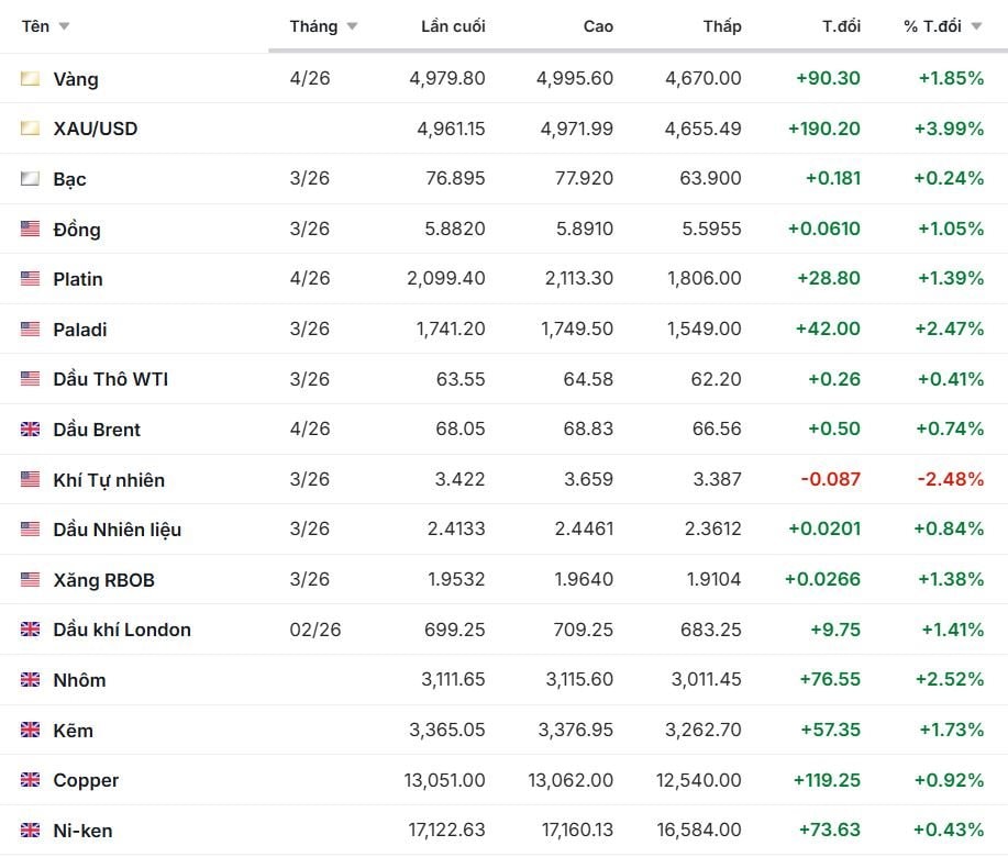 Hợp đồng vàng kỳ hạn tháng 4 đóng cửa ở mức 4,979.80, tăng 90.30 tương đương +1.85%, với biên độ dao động trong phiên từ 4,670.00 đến 4,995.60. Giá XAU/USD tăng mạnh hơn, lên 4,961.15, cộng 190.20 điểm (+3.99%), phản ánh lực mua nổi bật trên thị trường vàng giao ngay.