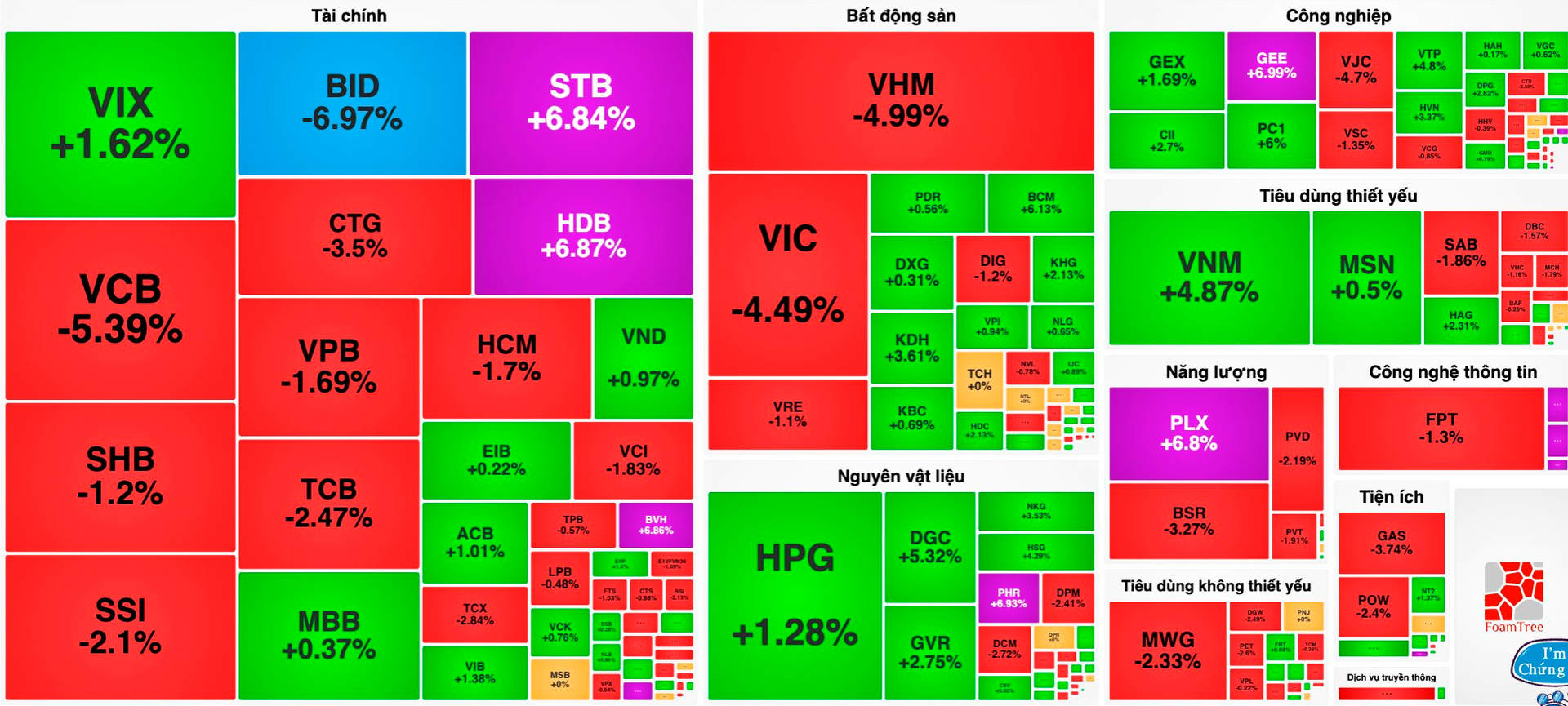 Trong nhóm ngân hàng, VCB -5,39%, CTG -3,5%, TCB -2,47%, VPB -1,69%, SHB -1,2%, LPB -0,48%, TPB -0,57%, tiếp tục tác động tiêu cực lên chỉ số chính.